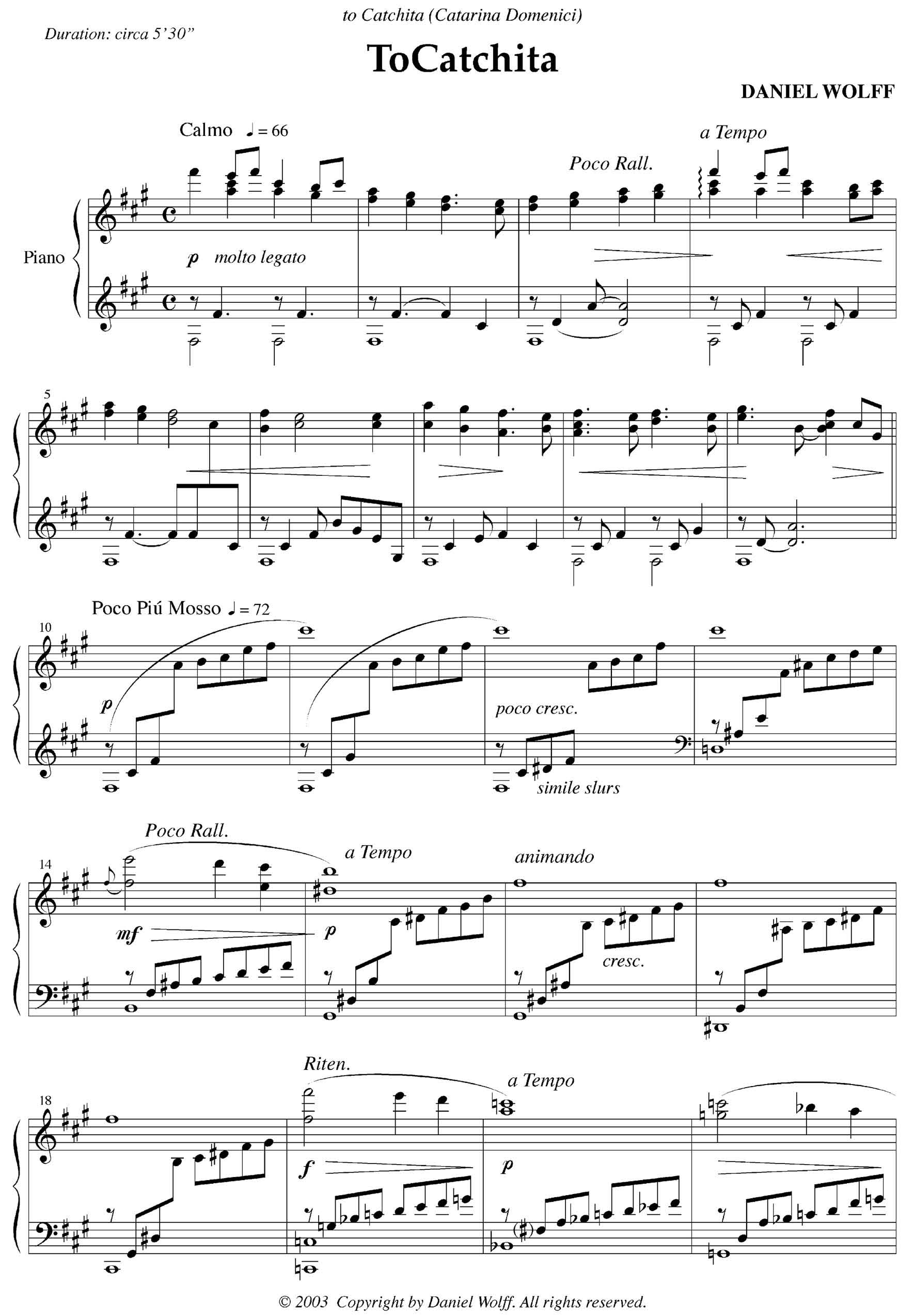 The title ToCatchita is a play on words. The piece, composed in 2003, is dedicated to pianist Catarina Domenici, whose nickname is Catchita. As the piece was written to Catchita, I decided to name it ToCatchita, a title which at the same time represents the diminutive of toccata, the genre of this work.