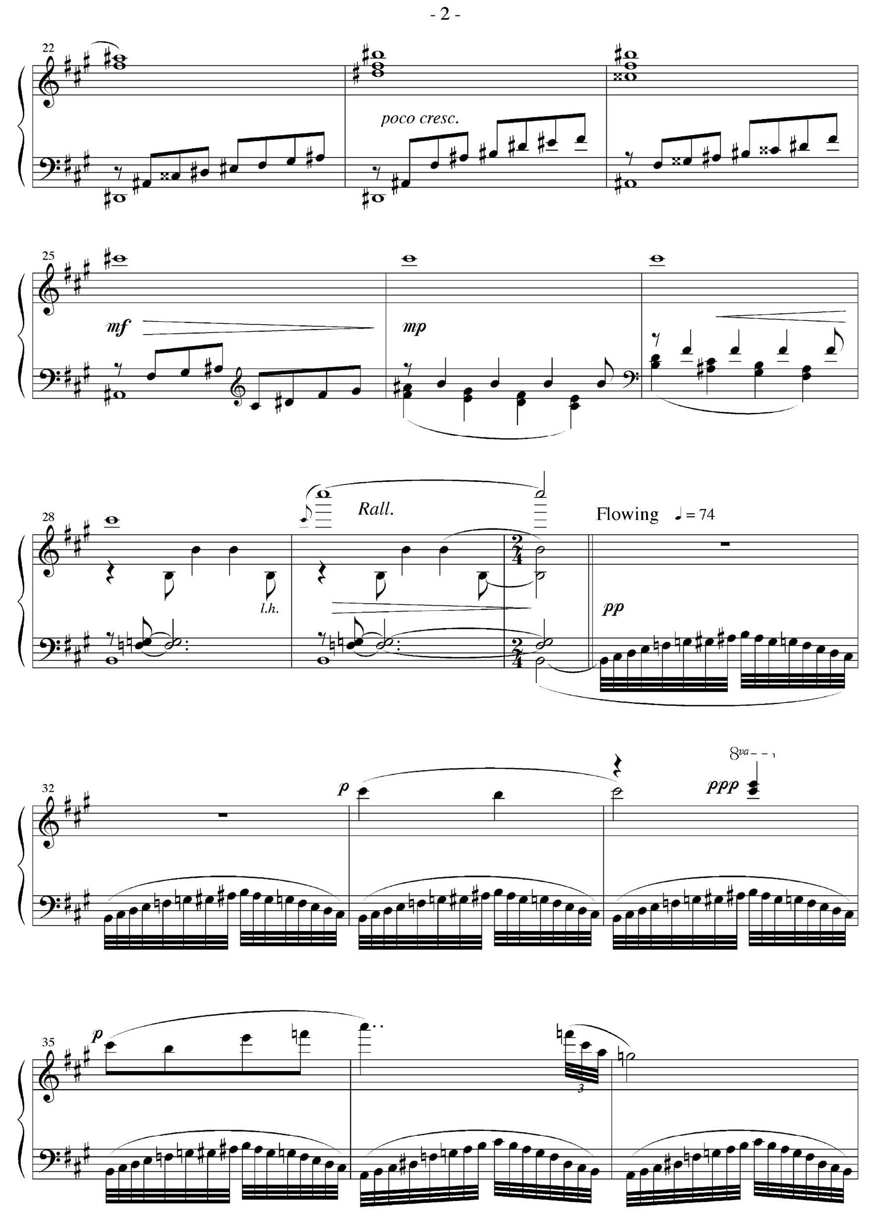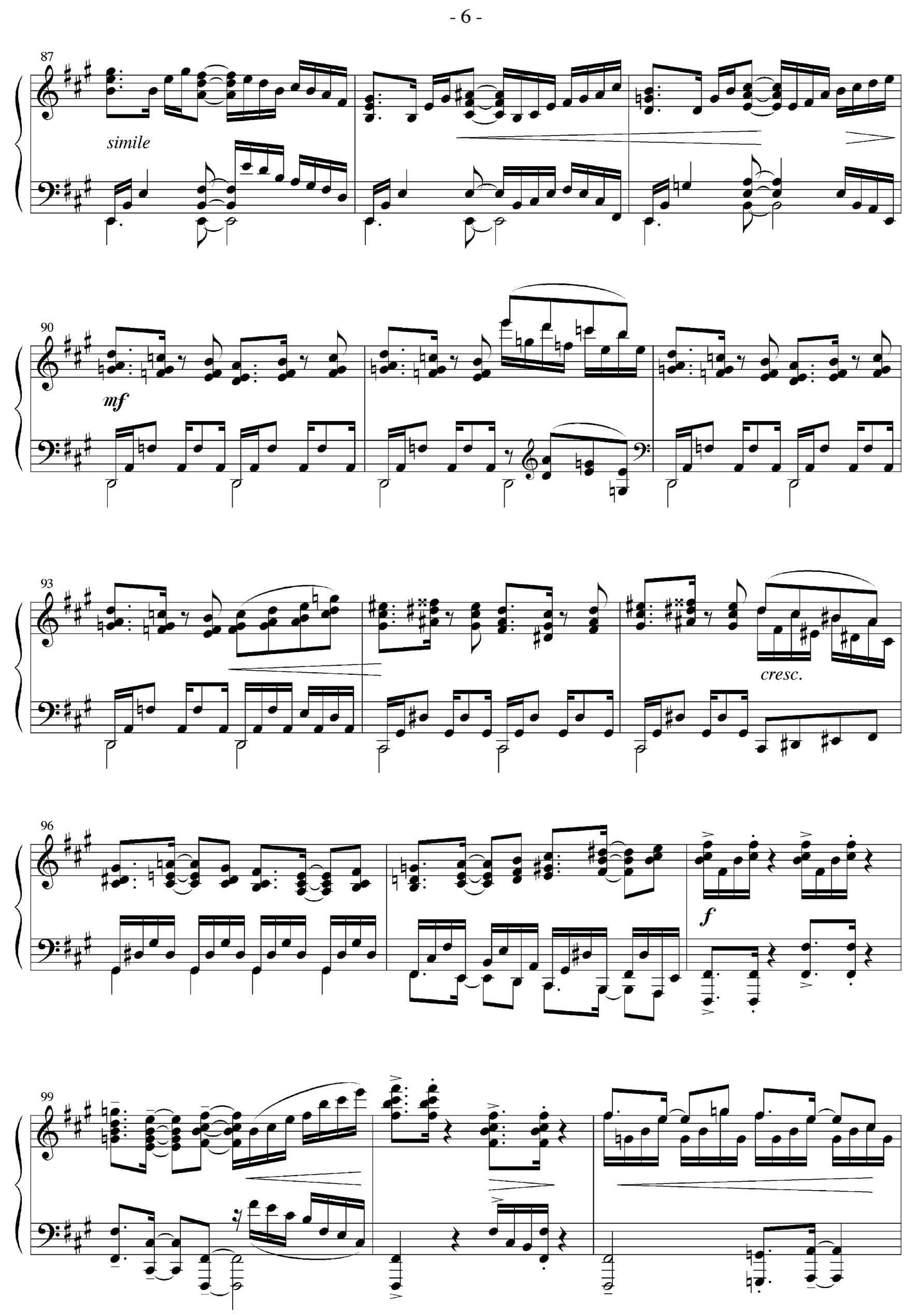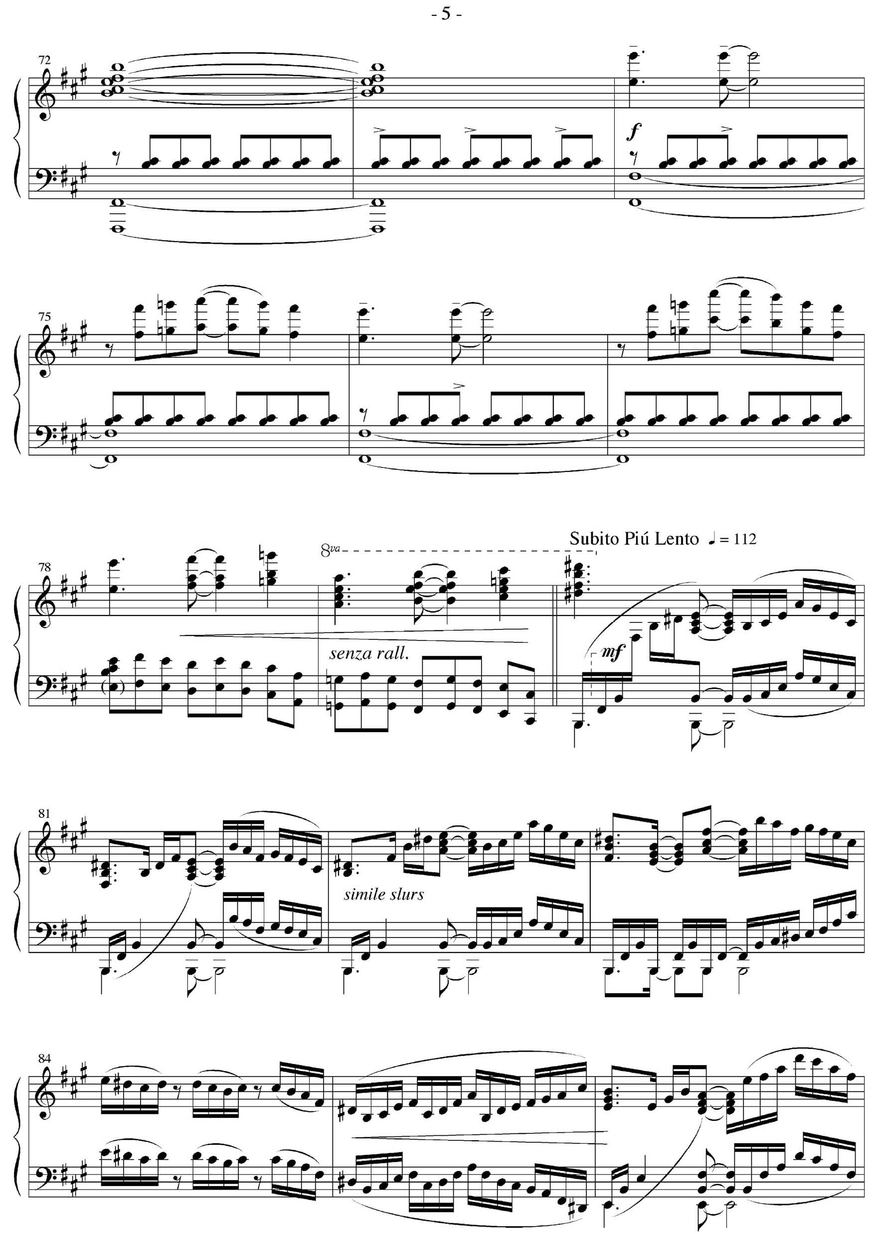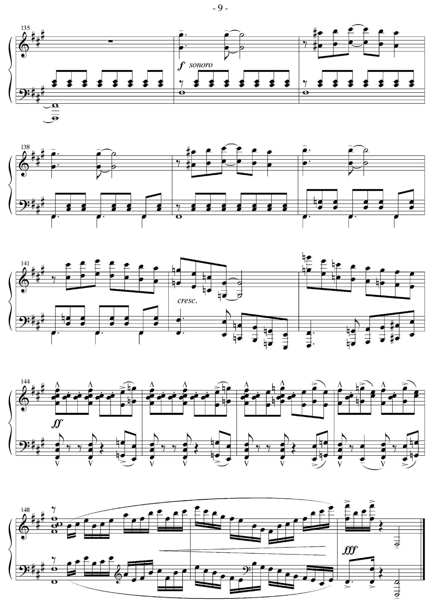 ToCatchita is divided in three sections. The first section, calm and slow, orbits the note F-sharp, first as a pedal tone, then more subliminally as a chord member. After a short insistence on the upper fifth C-sharp, the section ends on the lower fifth B. The second section is characterized by the constant scale passagework in the left hand, with the harmonic move-ment resulting from the use of different types of scales. The third section, in ABA form, is again centered on the note F-sharp. The ostinato of the A part is contrasted by the baião of the B part. Baião is a typical rhythm of the northeast region of Brazil.