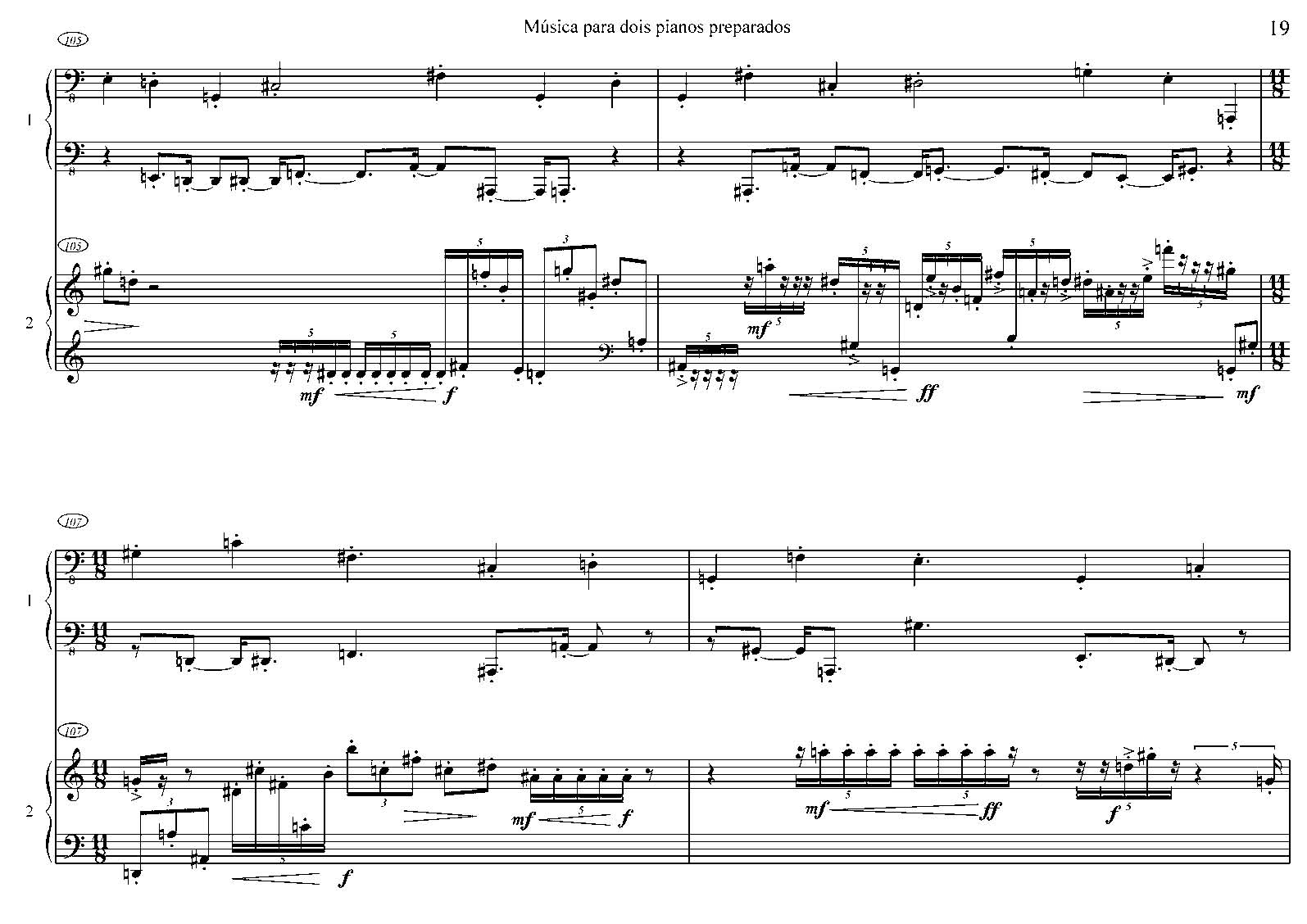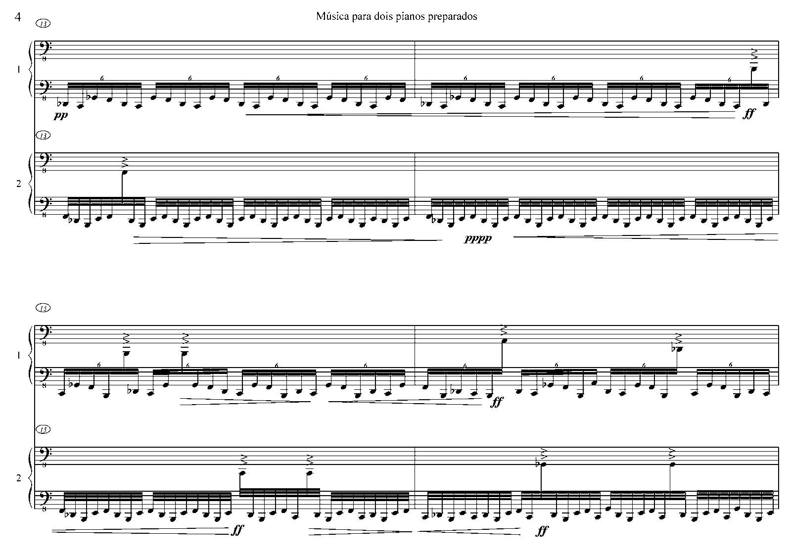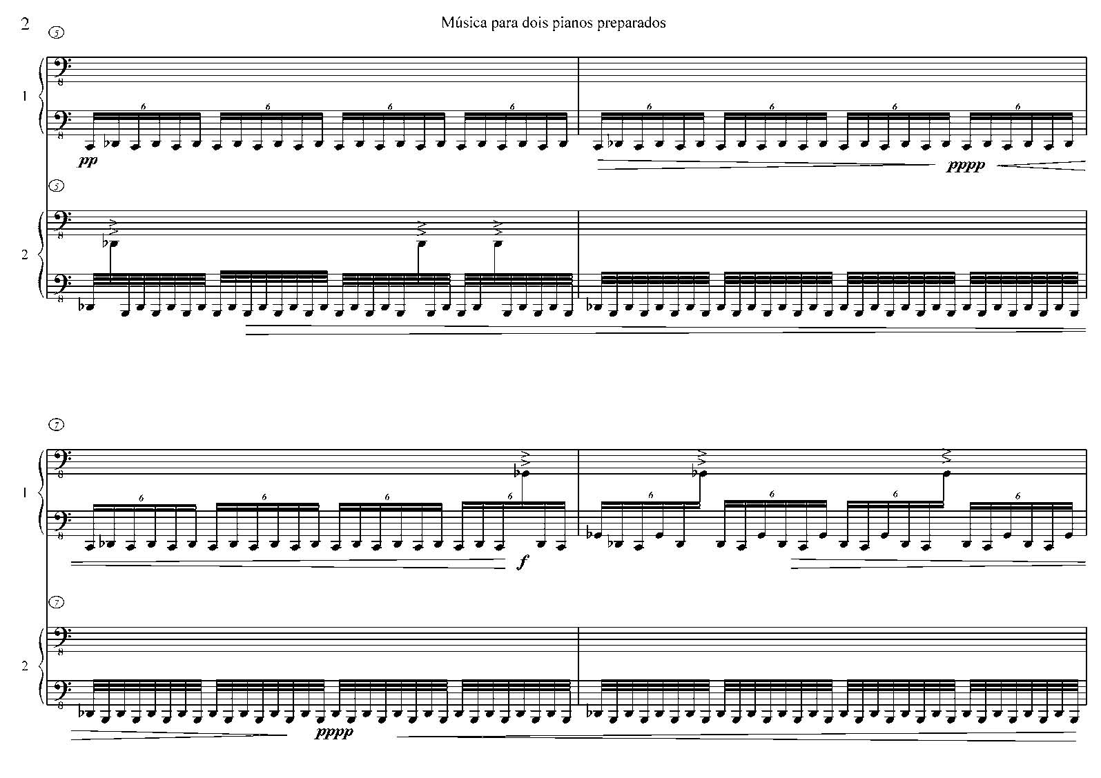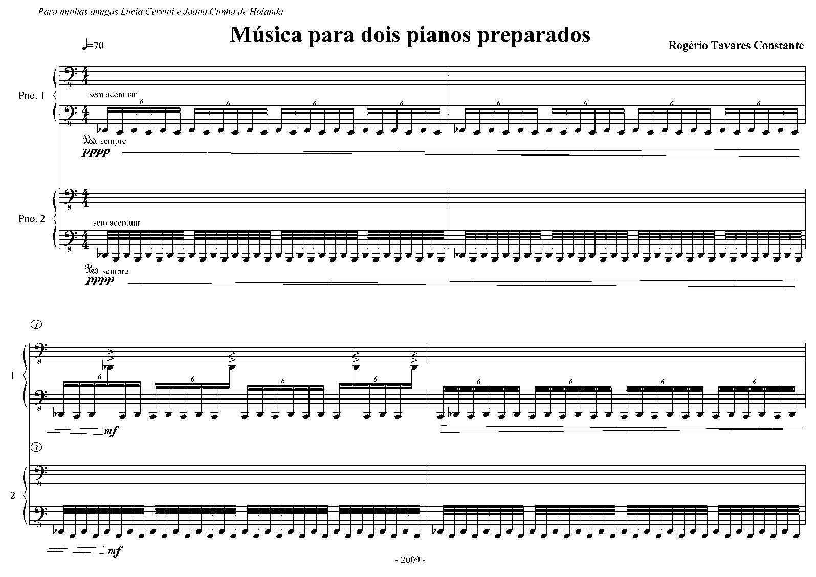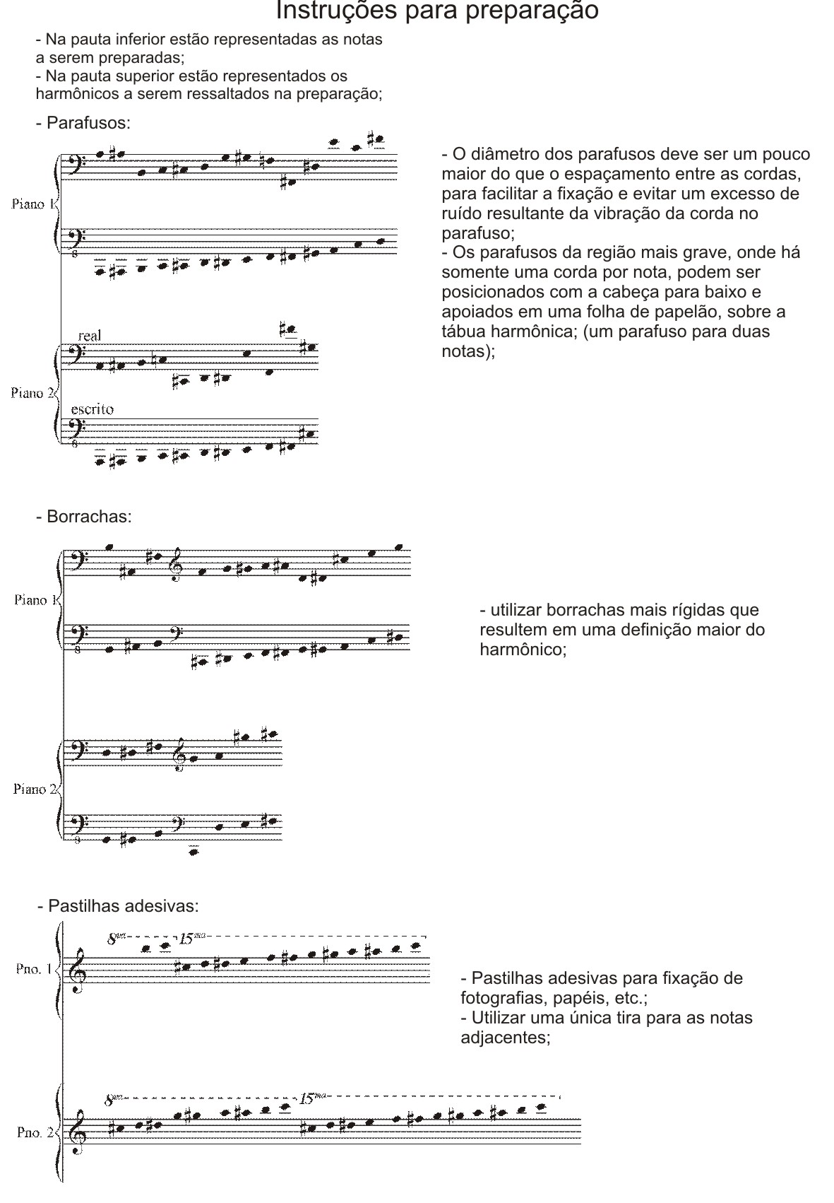 Música para dois pianos preparados é parte integrante da pesquisa “Práticas interpretativas no Repertório Brasileiro de Piano Preparado”. A motivação inicial da composição foi a idéia de se realizar um concerto com duas obras para dois pianos preparados. A preparação utiliza os materiais borracha, fita (ou pastilha) adesiva e parafusos. Os timbres resultantes desta preparação, aliados às outras técnicas expandidas utilizadas na obra e aos sons naturais do piano, são um dos fatores importantes na construção do percurso dramático da obra. A maneira de ligação entre os materiais dos dois pianos também influencia a forma e a condução do percurso dramático. Os dois pianos foram considerados como personagens independentes que por vezes se complementam ou se aproximam e em outros momentos se distanciam. A definição de alguns aspectos da organização de alturas foi determinada pelas limitações de registro em cada um dos timbres utilizados na peça. A preparação utilizada apresenta em linhas gerais uma conexão entre os timbres da preparação com borrachas e a região média e grave, bem como entre os da preparação com massa adesiva e a região superaguda. A preparação com parafusos está presente na região subgrave e grave, enquanto as notas sem preparação ocupam principalmente a região média e aguda.