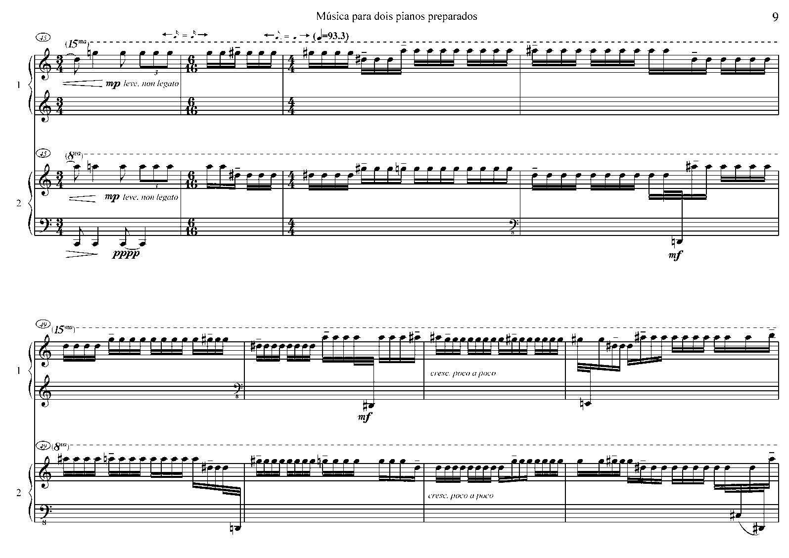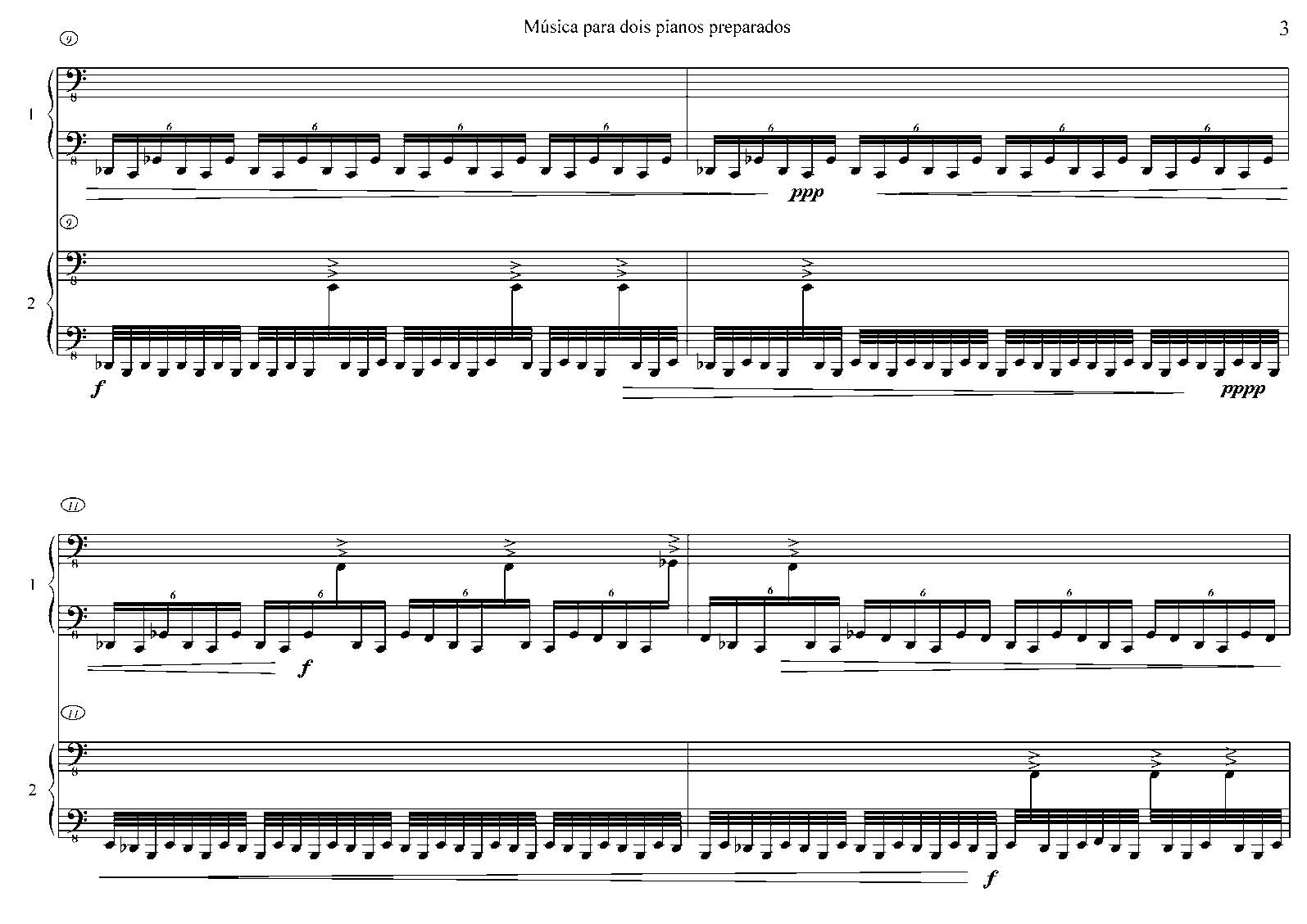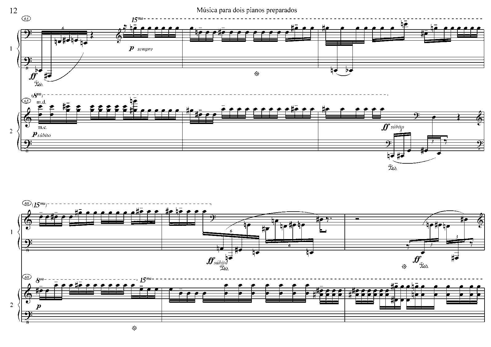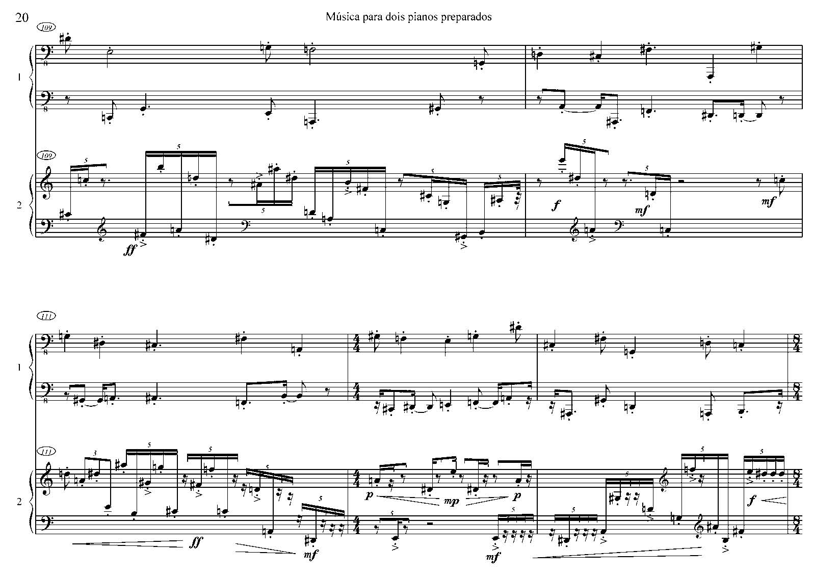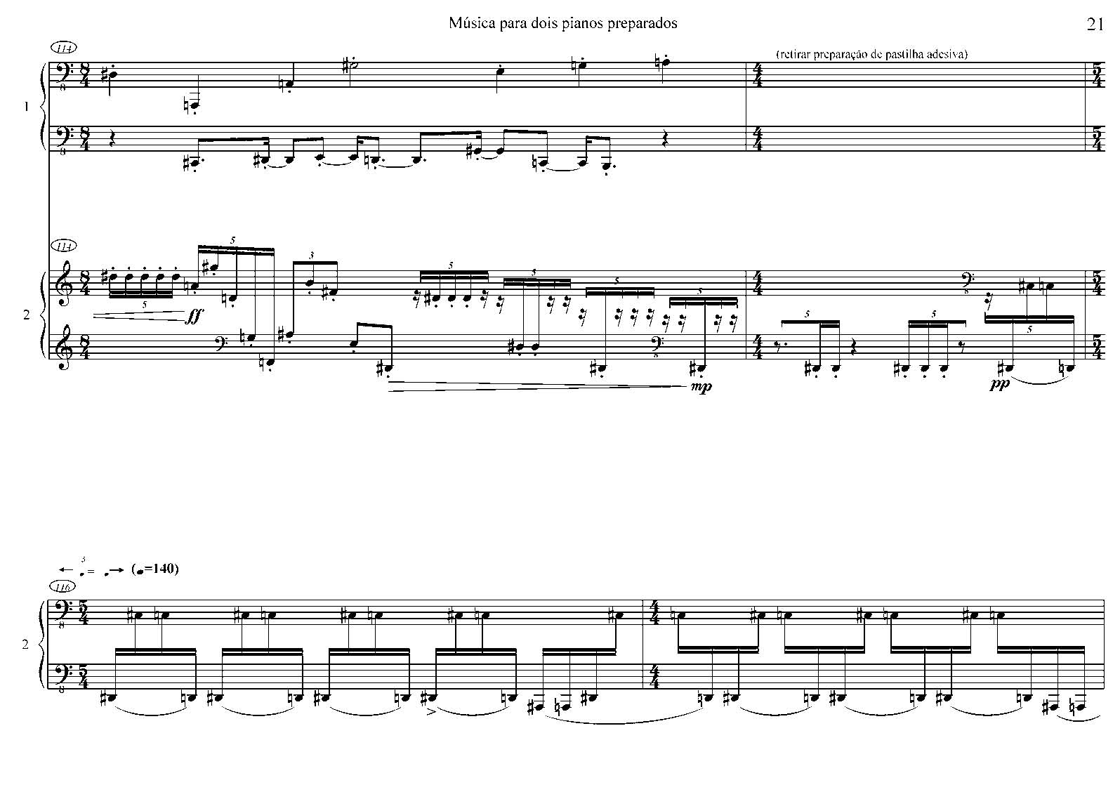 Música para dois pianos preparados é parte integrante da pesquisa “Práticas interpretativas no Repertório Brasileiro de Piano Preparado”. A motivação inicial da composição foi a idéia de se realizar um concerto com duas obras para dois pianos preparados. A preparação utiliza os materiais borracha, fita (ou pastilha) adesiva e parafusos. Os timbres resultantes desta preparação, aliados às outras técnicas expandidas utilizadas na obra e aos sons naturais do piano, são um dos fatores importantes na construção do percurso dramático da obra. A maneira de ligação entre os materiais dos dois pianos também influencia a forma e a condução do percurso dramático. Os dois pianos foram considerados como personagens independentes que por vezes se complementam ou se aproximam e em outros momentos se distanciam. A definição de alguns aspectos da organização de alturas foi determinada pelas limitações de registro em cada um dos timbres utilizados na peça. A preparação utilizada apresenta em linhas gerais uma conexão entre os timbres da preparação com borrachas e a região média e grave, bem como entre os da preparação com massa adesiva e a região superaguda. A preparação com parafusos está presente na região subgrave e grave, enquanto as notas sem preparação ocupam principalmente a região média e aguda.