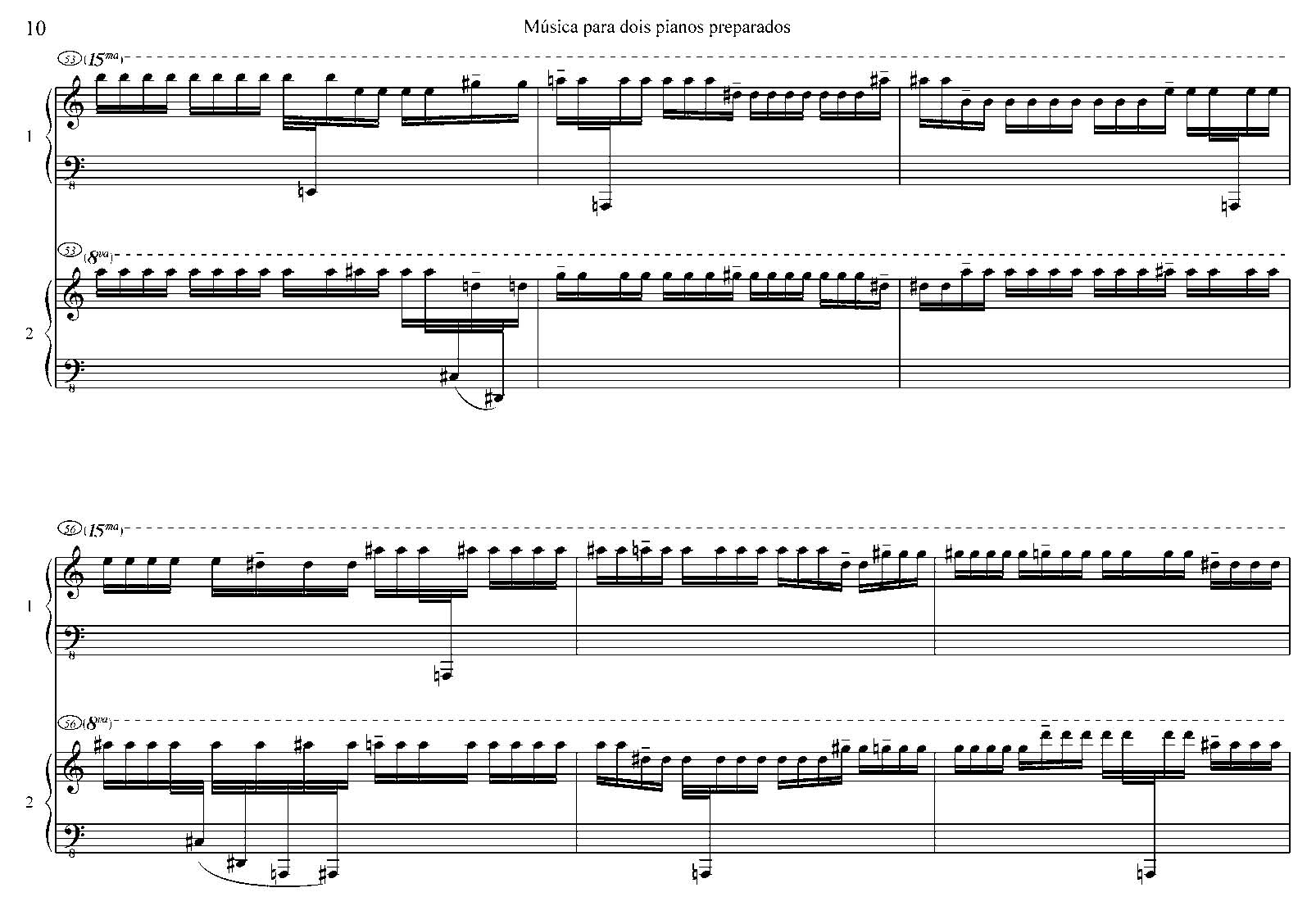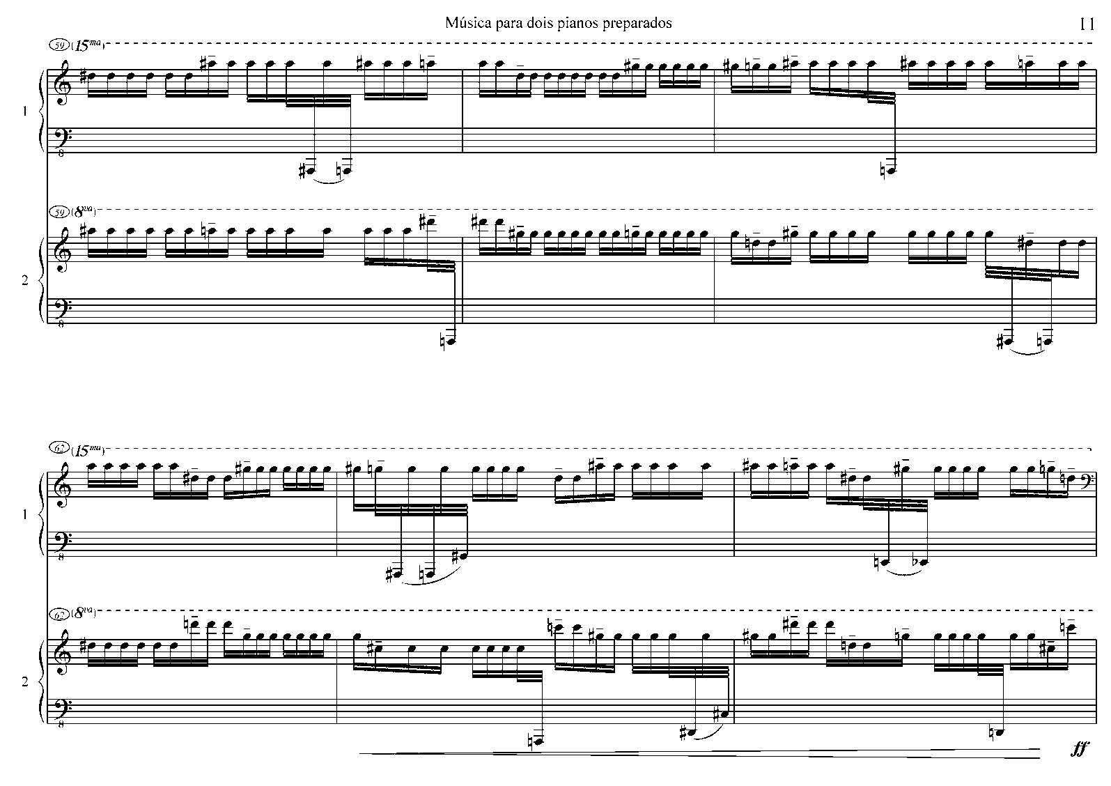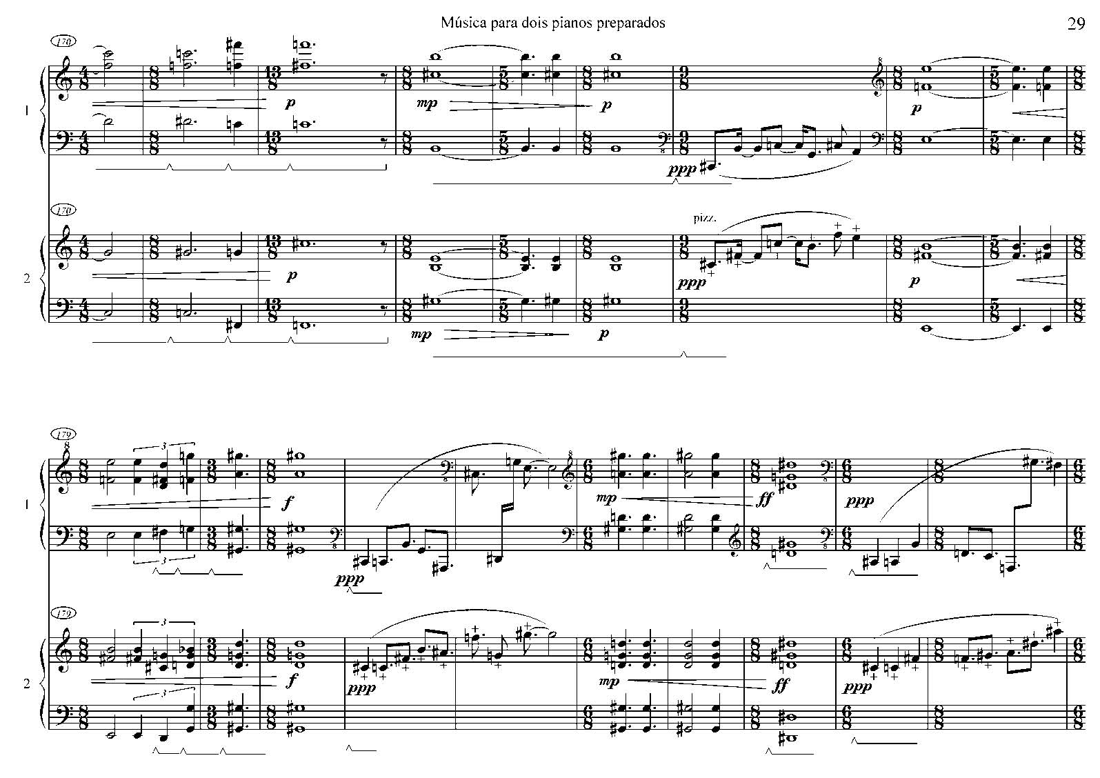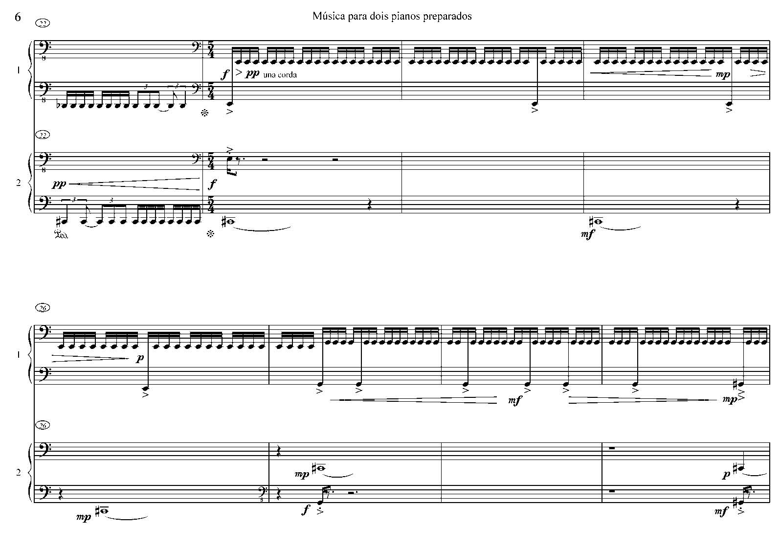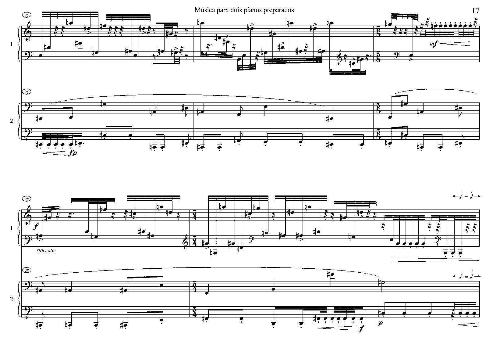 Música para dois pianos preparados é parte integrante da pesquisa “Práticas interpretativas no Repertório Brasileiro de Piano Preparado”. A motivação inicial da composição foi a idéia de se realizar um concerto com duas obras para dois pianos preparados. A preparação utiliza os materiais borracha, fita (ou pastilha) adesiva e parafusos. Os timbres resultantes desta preparação, aliados às outras técnicas expandidas utilizadas na obra e aos sons naturais do piano, são um dos fatores importantes na construção do percurso dramático da obra. A maneira de ligação entre os materiais dos dois pianos também influencia a forma e a condução do percurso dramático. Os dois pianos foram considerados como personagens independentes que por vezes se complementam ou se aproximam e em outros momentos se distanciam. A definição de alguns aspectos da organização de alturas foi determinada pelas limitações de registro em cada um dos timbres utilizados na peça. A preparação utilizada apresenta em linhas gerais uma conexão entre os timbres da preparação com borrachas e a região média e grave, bem como entre os da preparação com massa adesiva e a região superaguda. A preparação com parafusos está presente na região subgrave e grave, enquanto as notas sem preparação ocupam principalmente a região média e aguda.