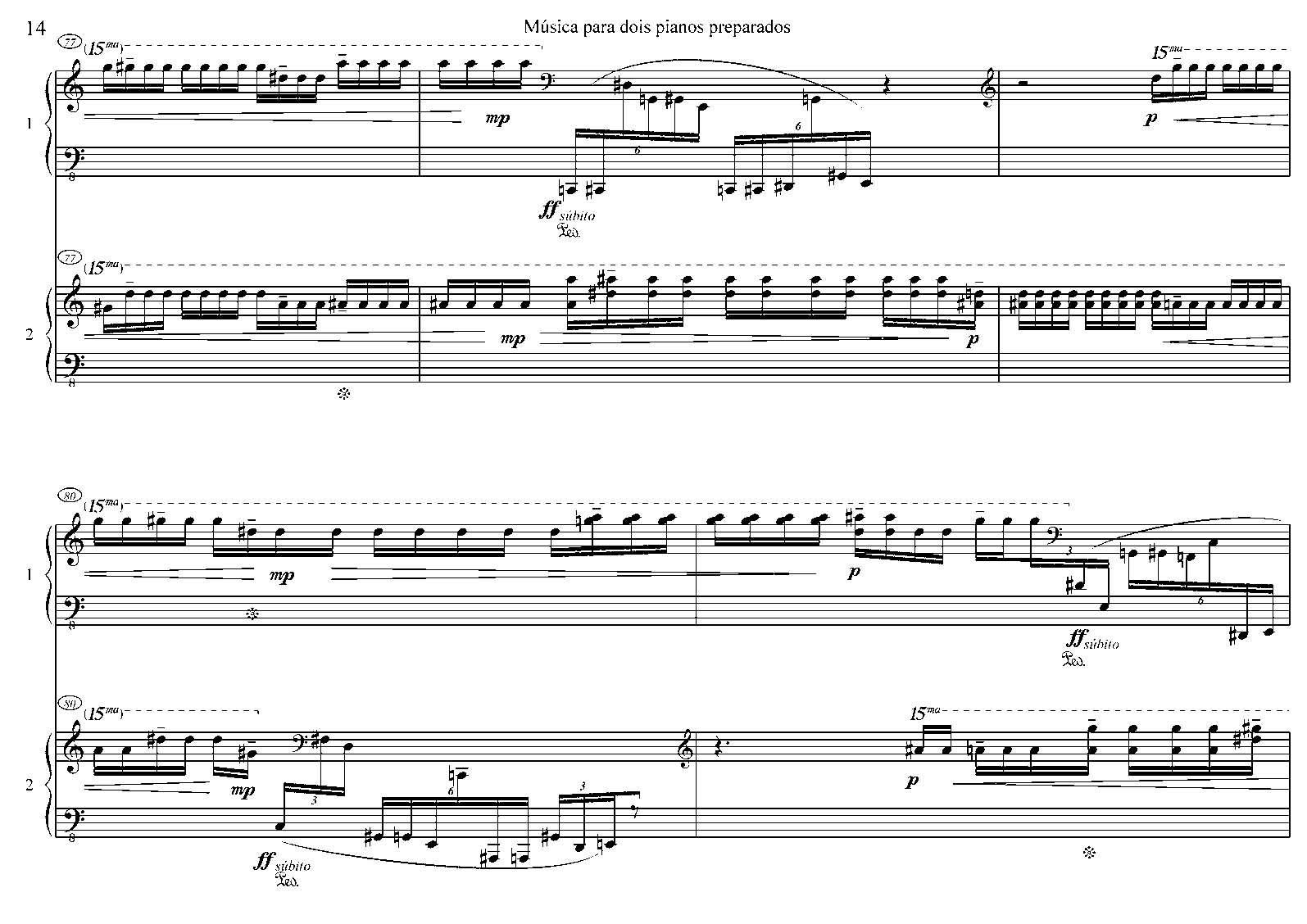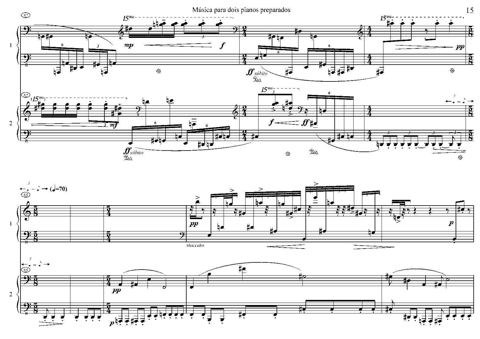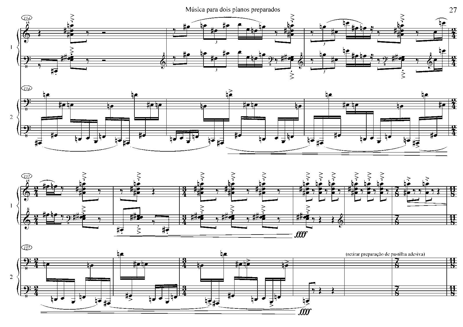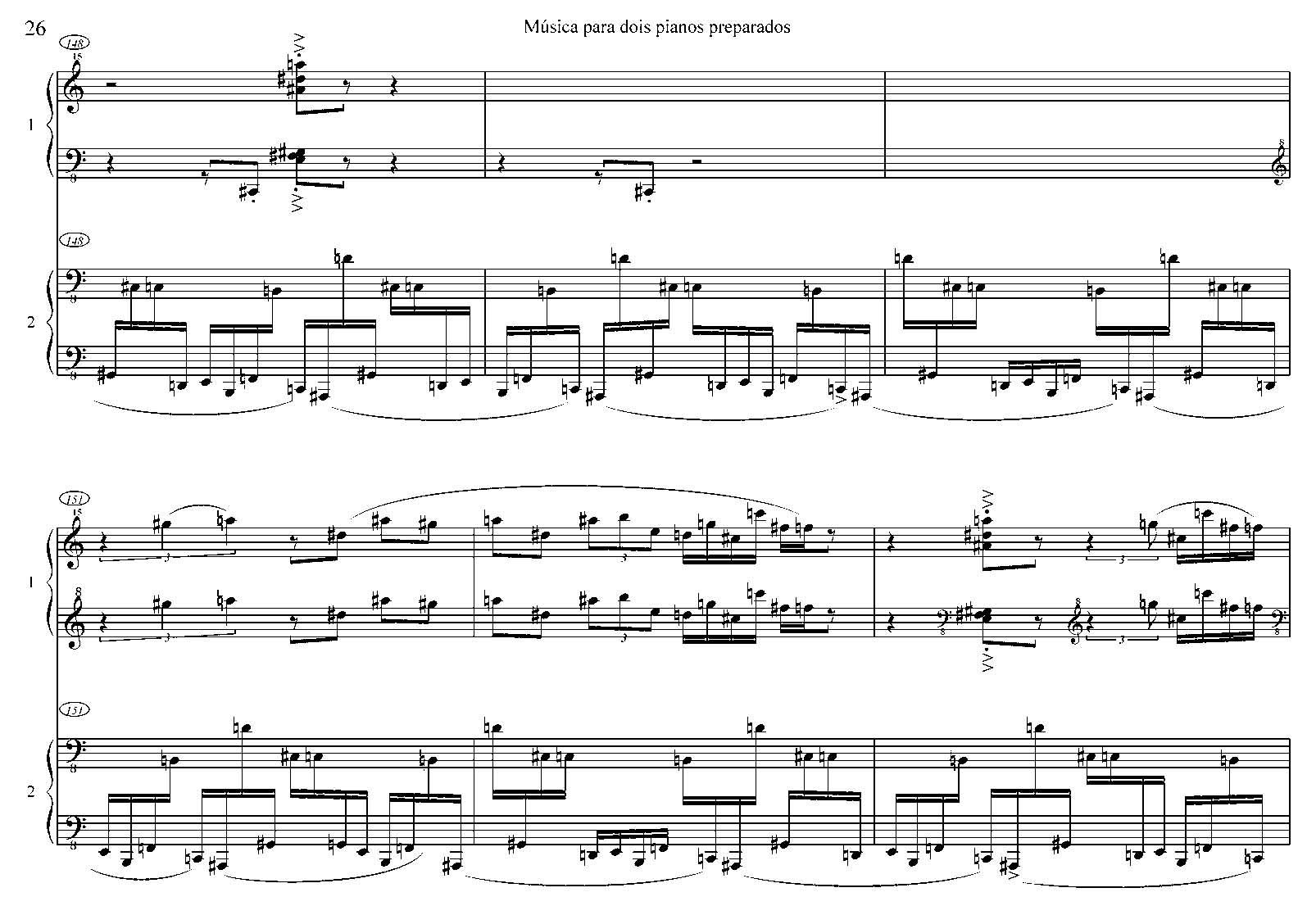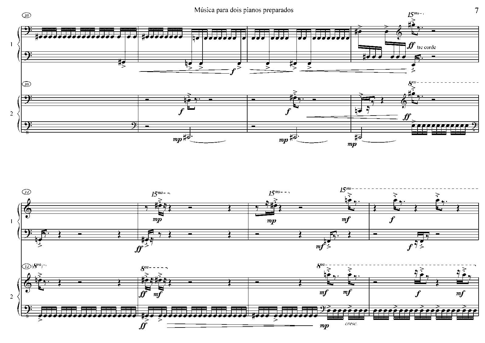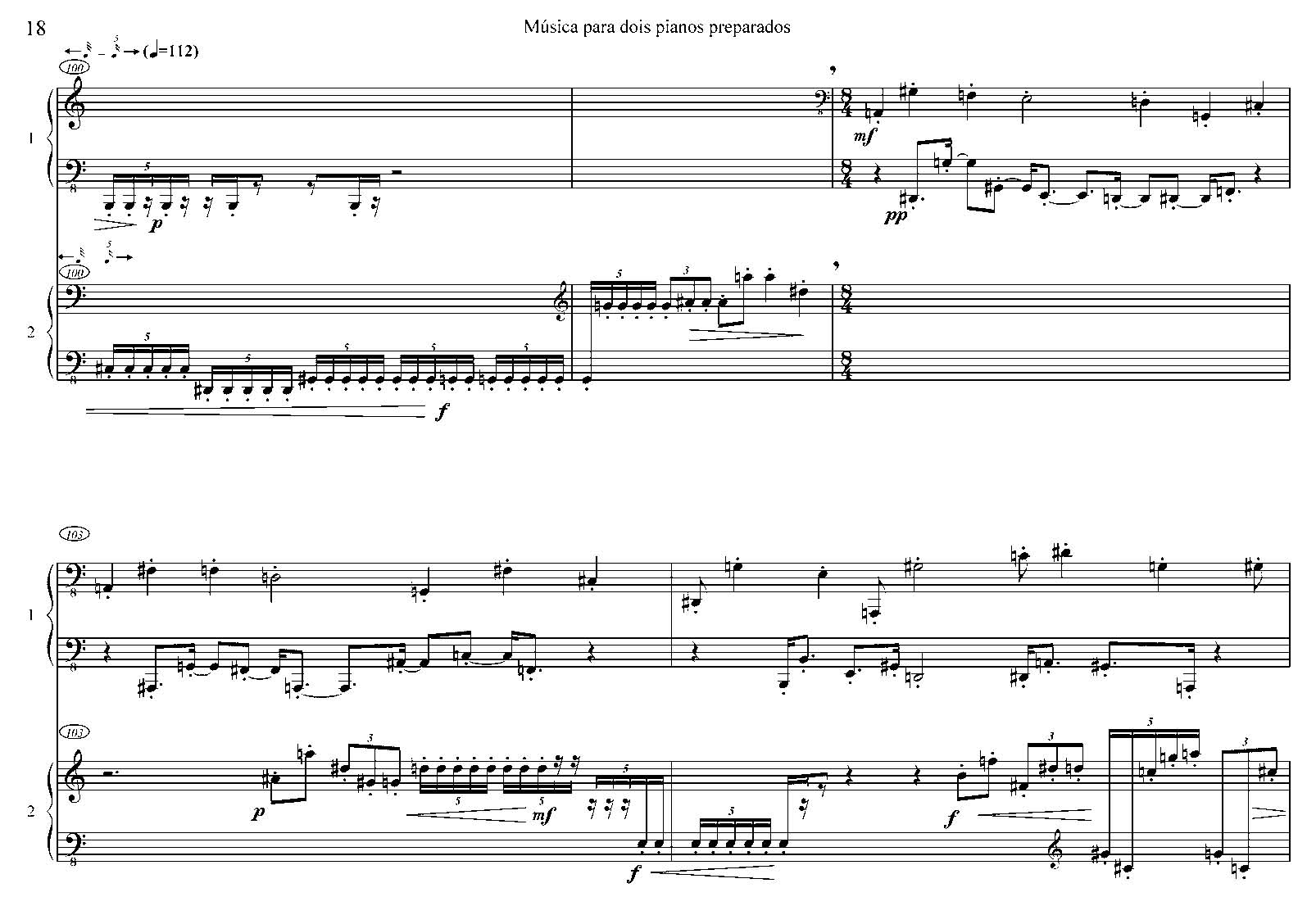 Música para dois pianos preparados é parte integrante da pesquisa “Práticas interpretativas no Repertório Brasileiro de Piano Preparado”. A motivação inicial da composição foi a idéia de se realizar um concerto com duas obras para dois pianos preparados. A preparação utiliza os materiais borracha, fita (ou pastilha) adesiva e parafusos. Os timbres resultantes desta preparação, aliados às outras técnicas expandidas utilizadas na obra e aos sons naturais do piano, são um dos fatores importantes na construção do percurso dramático da obra. A maneira de ligação entre os materiais dos dois pianos também influencia a forma e a condução do percurso dramático. Os dois pianos foram considerados como personagens independentes que por vezes se complementam ou se aproximam e em outros momentos se distanciam. A definição de alguns aspectos da organização de alturas foi determinada pelas limitações de registro em cada um dos timbres utilizados na peça. A preparação utilizada apresenta em linhas gerais uma conexão entre os timbres da preparação com borrachas e a região média e grave, bem como entre os da preparação com massa adesiva e a região superaguda. A preparação com parafusos está presente na região subgrave e grave, enquanto as notas sem preparação ocupam principalmente a região média e aguda.