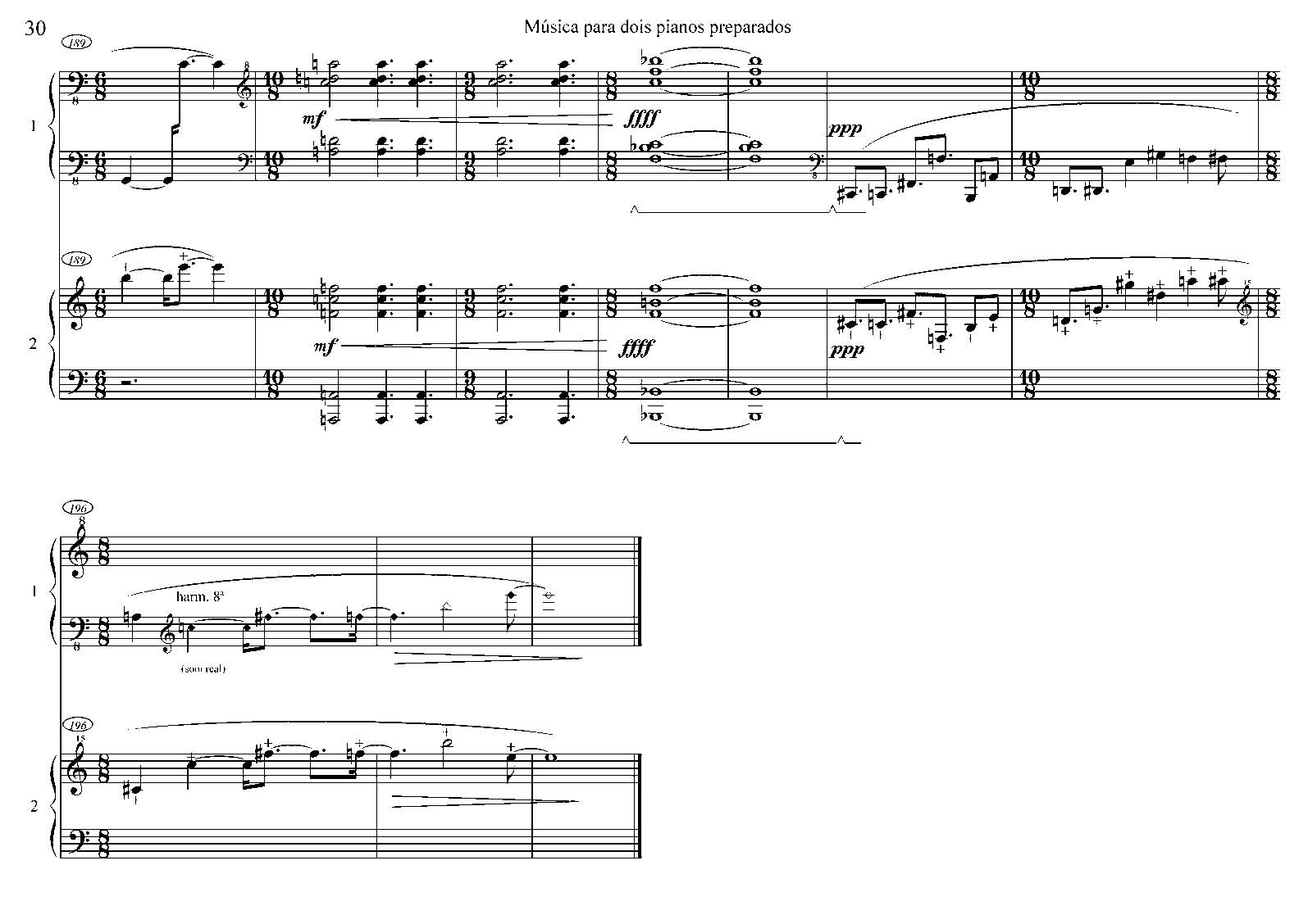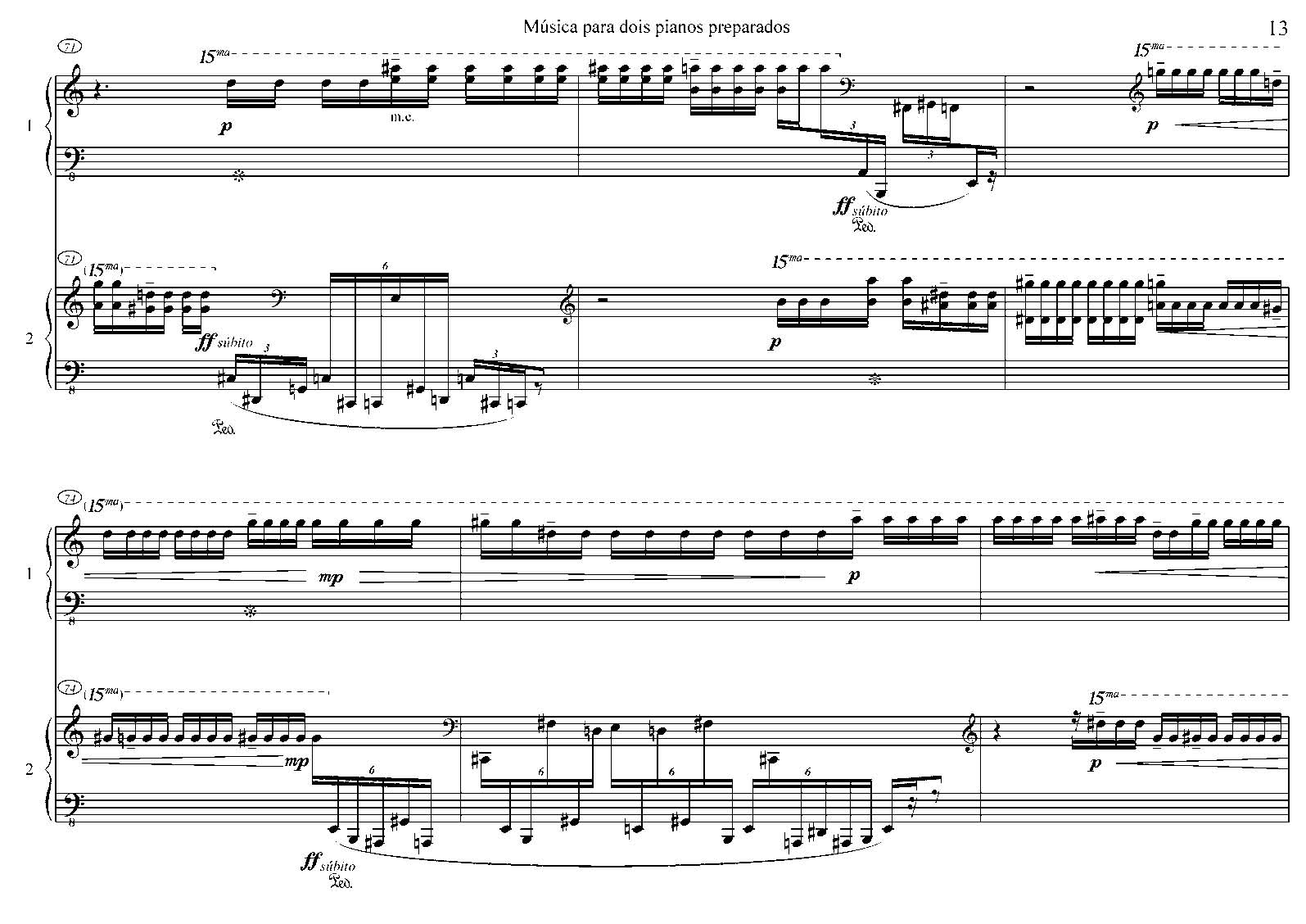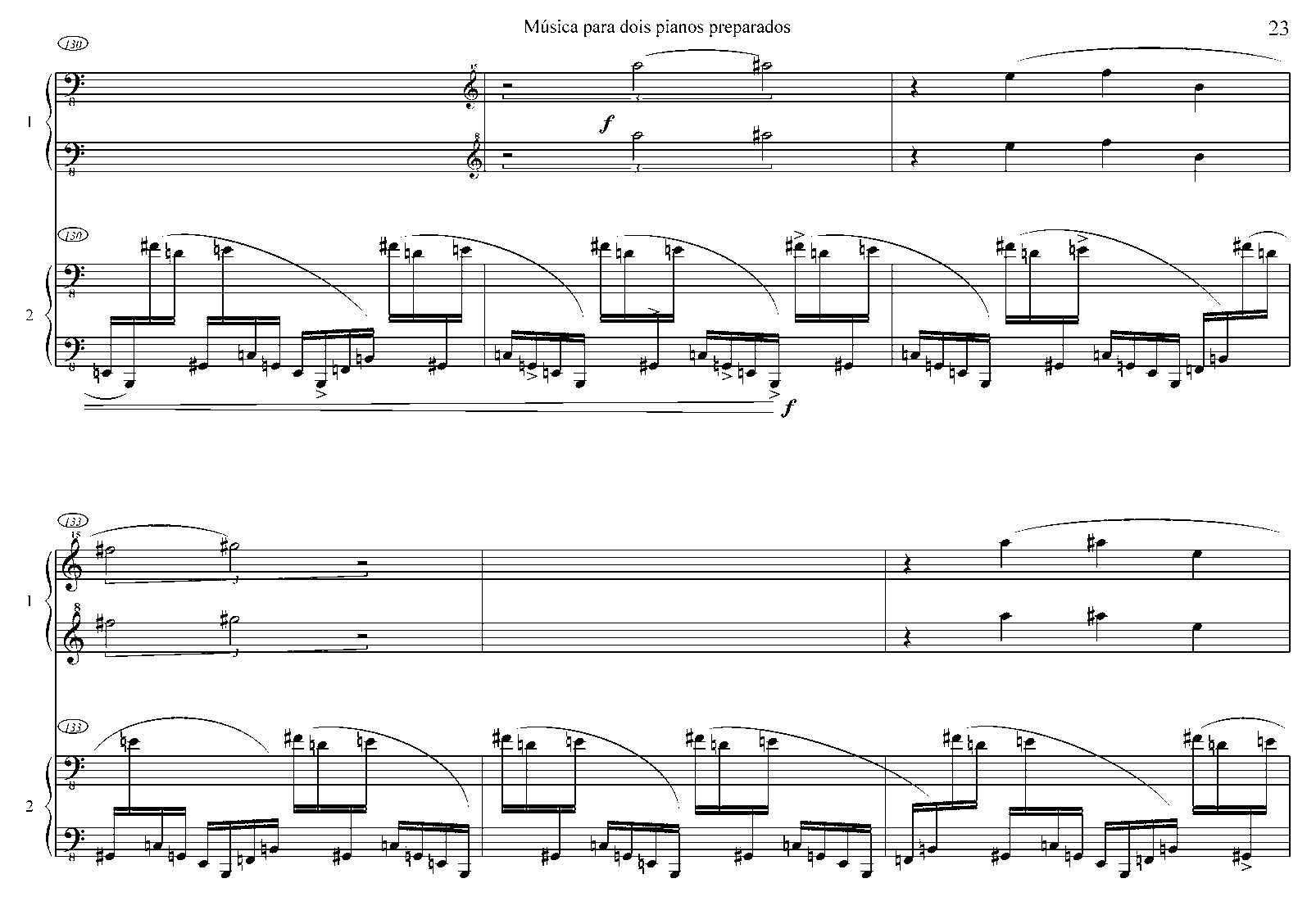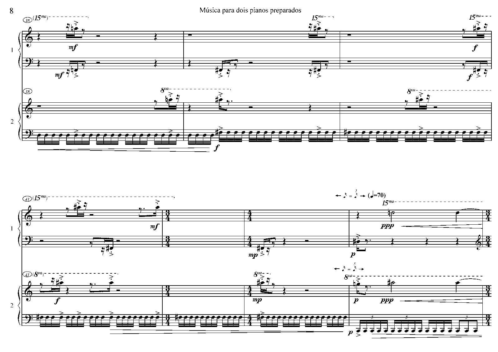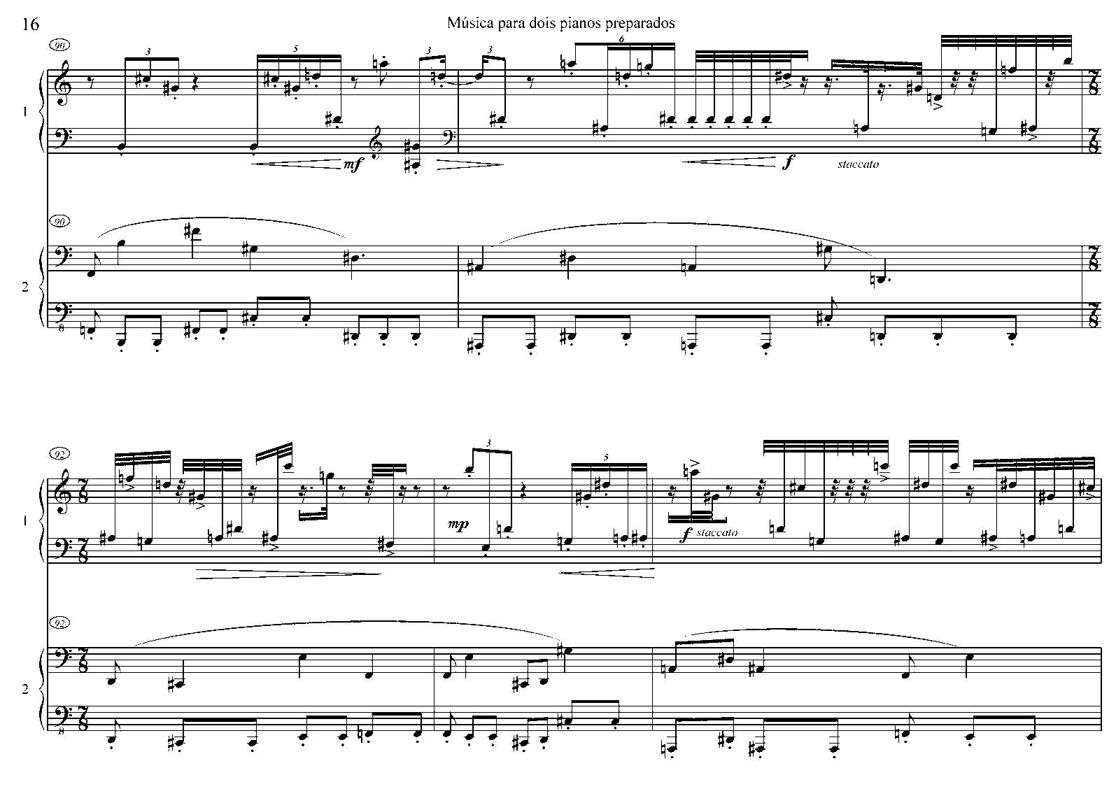Música para dois pianos preparados é parte integrante da pesquisa “Práticas interpretativas no Repertório Brasileiro de Piano Preparado”. A motivação inicial da composição foi a idéia de se realizar um concerto com duas obras para dois pianos preparados. A preparação utiliza os materiais borracha, fita (ou pastilha) adesiva e parafusos. Os timbres resultantes desta preparação, aliados às outras técnicas expandidas utilizadas na obra e aos sons naturais do piano, são um dos fatores importantes na construção do percurso dramático da obra. A maneira de ligação entre os materiais dos dois pianos também influencia a forma e a condução do percurso dramático. Os dois pianos foram considerados como personagens independentes que por vezes se complementam ou se aproximam e em outros momentos se distanciam. A definição de alguns aspectos da organização de alturas foi determinada pelas limitações de registro em cada um dos timbres utilizados na peça. A preparação utilizada apresenta em linhas gerais uma conexão entre os timbres da preparação com borrachas e a região média e grave, bem como entre os da preparação com massa adesiva e a região superaguda. A preparação com parafusos está presente na região subgrave e grave, enquanto as notas sem preparação ocupam principalmente a região média e aguda.