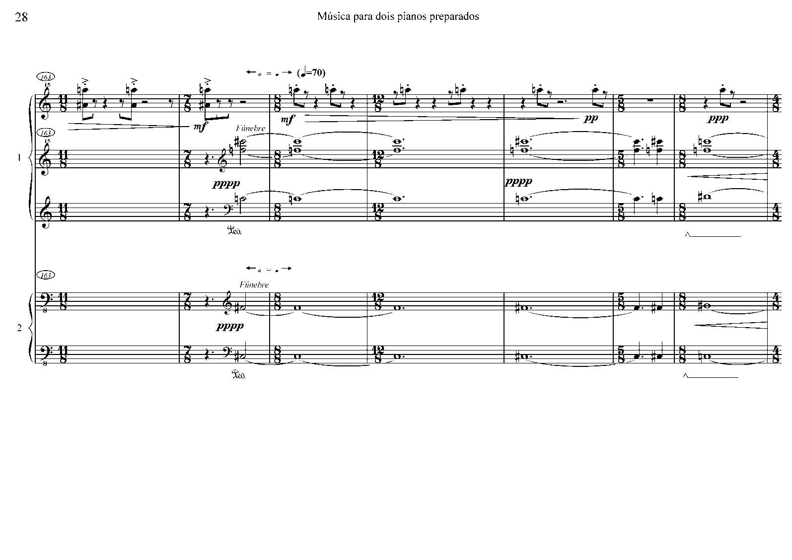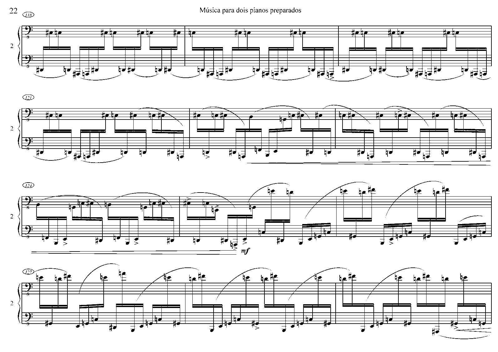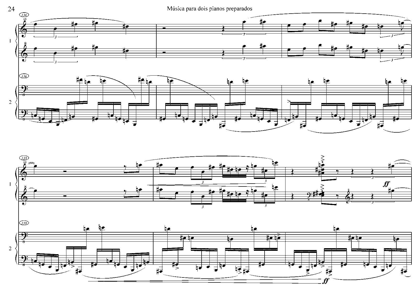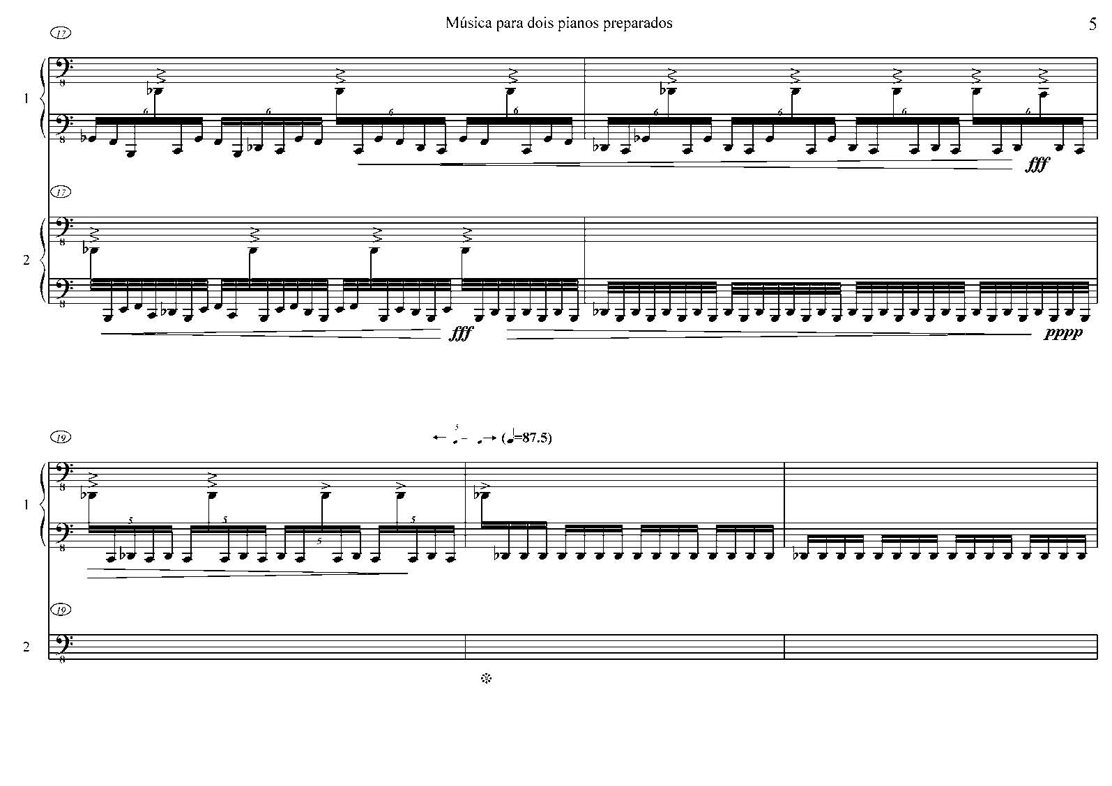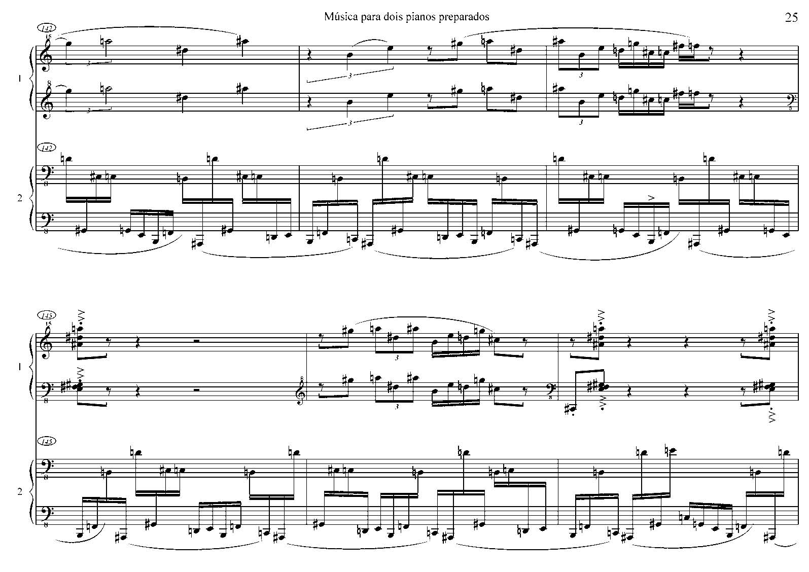 Música para dois pianos preparados é parte integrante da pesquisa “Práticas interpretativas no Repertório Brasileiro de Piano Preparado”. A motivação inicial da composição foi a idéia de se realizar um concerto com duas obras para dois pianos preparados. A preparação utiliza os materiais borracha, fita (ou pastilha) adesiva e parafusos. Os timbres resultantes desta preparação, aliados às outras técnicas expandidas utilizadas na obra e aos sons naturais do piano, são um dos fatores importantes na construção do percurso dramático da obra. A maneira de ligação entre os materiais dos dois pianos também influencia a forma e a condução do percurso dramático. Os dois pianos foram considerados como personagens independentes que por vezes se complementam ou se aproximam e em outros momentos se distanciam. A definição de alguns aspectos da organização de alturas foi determinada pelas limitações de registro em cada um dos timbres utilizados na peça. A preparação utilizada apresenta em linhas gerais uma conexão entre os timbres da preparação com borrachas e a região média e grave, bem como entre os da preparação com massa adesiva e a região superaguda. A preparação com parafusos está presente na região subgrave e grave, enquanto as notas sem preparação ocupam principalmente a região média e aguda.
