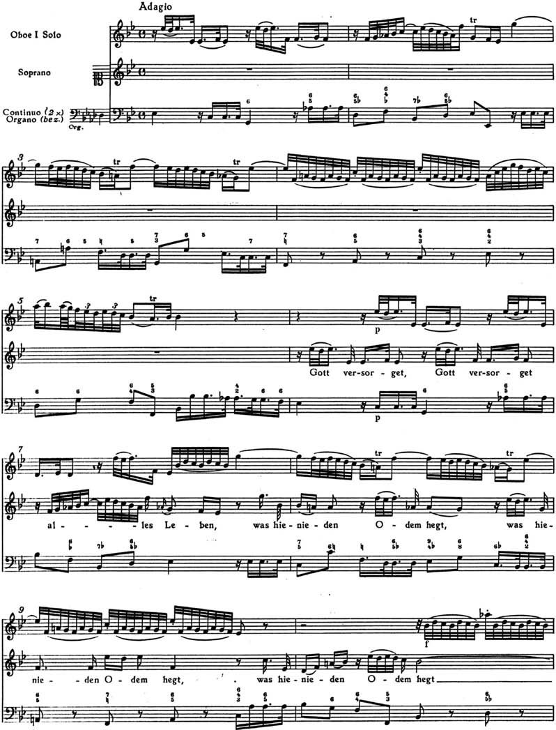 Narratio (c.6-20). O narratio tem como função instruir a audiência. Inicia-se com a apresentação do texto cantado pelo soprano. O salto de oitava e o ritmo pontuado, já anunciado pelo oboé no exordium, podem simbolicamente representar Deus. Esta afirmação é corroborada pela letra do texto que diz: “Deus cuida” (Gott versorget). Em seguida, as muitas notas compostas pelas fusas, simbolicamente poderiam representar as vidas, ou os fiéis, de que Deus cuidará. A letra neste trecho aponta: “(Deus cuida) de todas as vidas” (alles Leben).