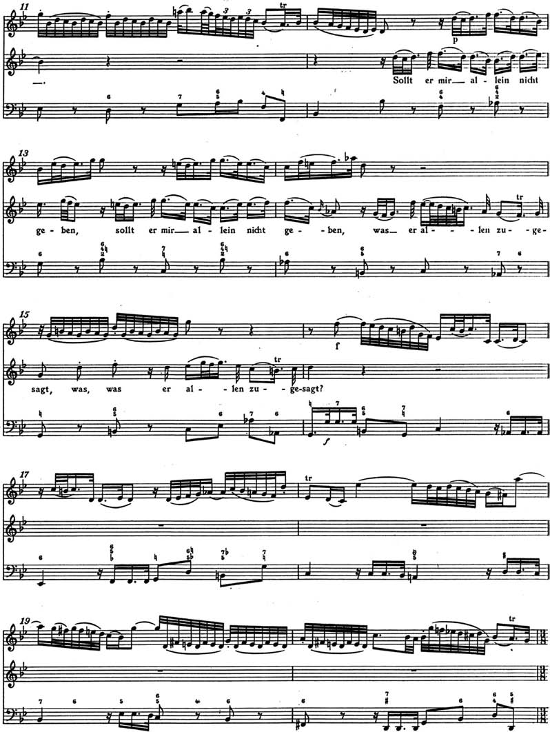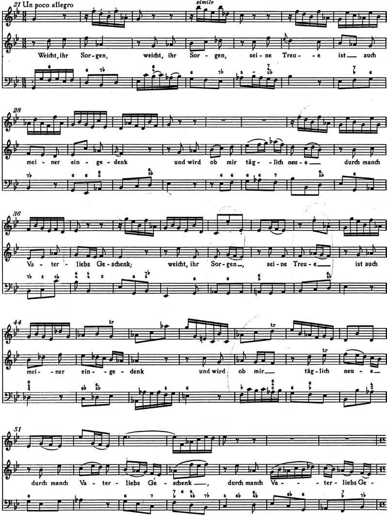 Confirmatio (c.21-57). Visava a confirmação das propostas anteriores. Aqui estabelece-se com uma mudança métrica e rítmica da composição. Esta mudança ocorre no compasso 21, com a indicação de tempo Un poco allegro, e métrica 3/8. Esta segunda parte da ária indica francamente uma alegre dança. Neste momento o texto diz: “Abandonem suas preocupações! A confiança Nele está também em meu pensamento e será renovada diariamente através de tantos presentes de Amor do Pai.” (Weicht, ihr Sorgen, seine Treue Ist auch meiner eigedenk/ Und wird ob mir täglich neue/ Durch manch Vater-Liebsgeschenk.). Esta ruptura da métrica do compasso, passando a ter um tempo perfeito, deixa a estrutura leve, explicitando o texto, que assume um caráter mais afirmativo da confiança que os fiéis deveriam ter no Pai.
