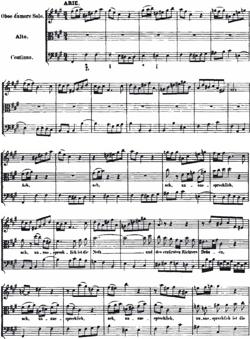 Neste momento ele faz uso do trítono na linha do canto, realçando ainda mais o que é “indizível”. Repete-se o trítono, com freqüência nesta seqüência. No compasso 21, o contralto mantém dois compassos de mesma nota sustentada com a palavra “Sofrimento”(Not). É um momento estático, agravado pelos arpejos descendente e ascendente do oboé d’Amore. Em seguida, no compasso 24, o contínuo apresenta a figura que, segundo Mattheson e Spiess (BARTEL, 1997, p. 251) se chama Emphasis, composta por uma linha descendente de semi-colcheias em escala truncada de terças, de grande dramaticidade e que voltará a se repetir no compasso 69. Neste momento, o texto fala sobre: “as ameaças do temível Juiz encolerizado” (des erzürnten Richters Dräuen!). O ponto central do narratio acontece no texto na palavra “Medo” (Angst). Aqui o compositor movimenta cromaticamente a linha de colcheias no oboé d’Amore. Na voz, em notas em tremulato e sustentadas, com duração de dois compassos, faz, para uma maior tensão, um movimento cromático ascendente entre um compasso e outro. A palavra medo aparece esta única vez na ária.