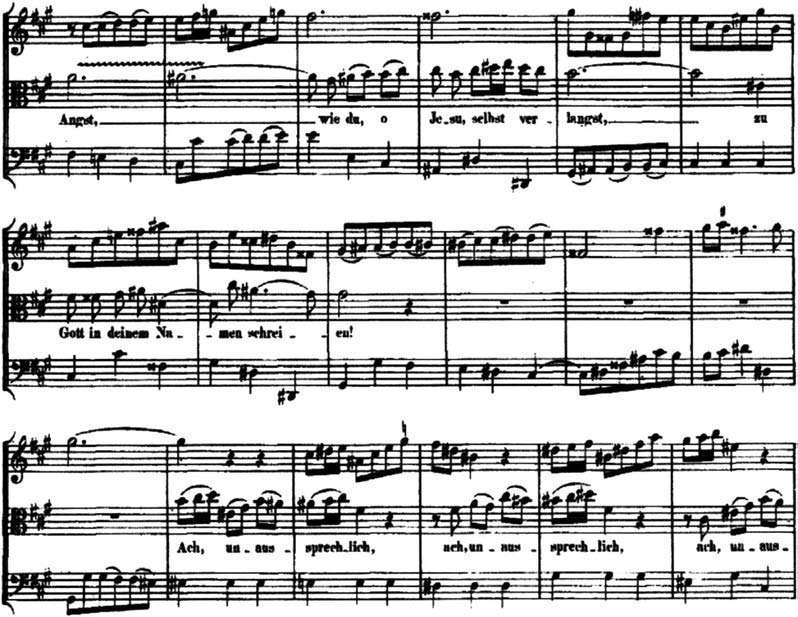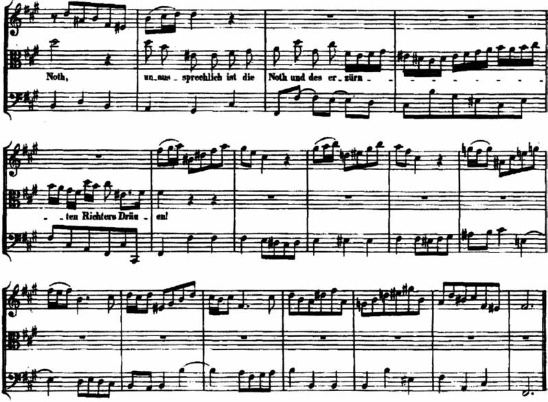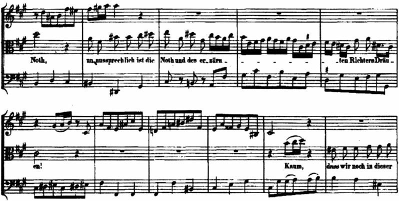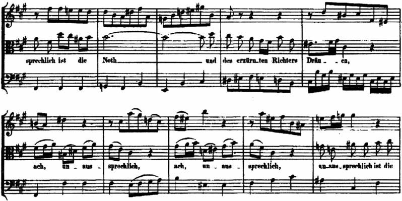 Narratio (c.13-38). Inicia-se com o canto realizando uma figura rítmica de três notas ascendentes (fá, sol, lá) que grita “Ach” seguida por pausas. Na segunda vez o grito é realizado num tom acima (sol, lá, si) ainda seguido por pausas que reforçam a idéia de que, por ser tão terrível o fato tratado é indizível. O grito retorna uma terceira vez, desta vez realizado com uma única nota (dó) e afirma na seqüência: “Ah, indizíveis são os sofrimentos” (Ach, unausprechlich ist die Not). A figura retórica aqui utilizada, que segundo Bartel (1997, pp.392-393) quando se repete, pode ser vista como um clímax, é o suspiratio ou stenasmus, definida por Kircher como a figura: “...através da qual pode-se expressar gemidos ou suspiros com pausas (...) que, aqui, chamamos de suspirai”.