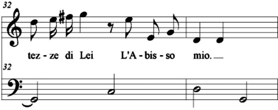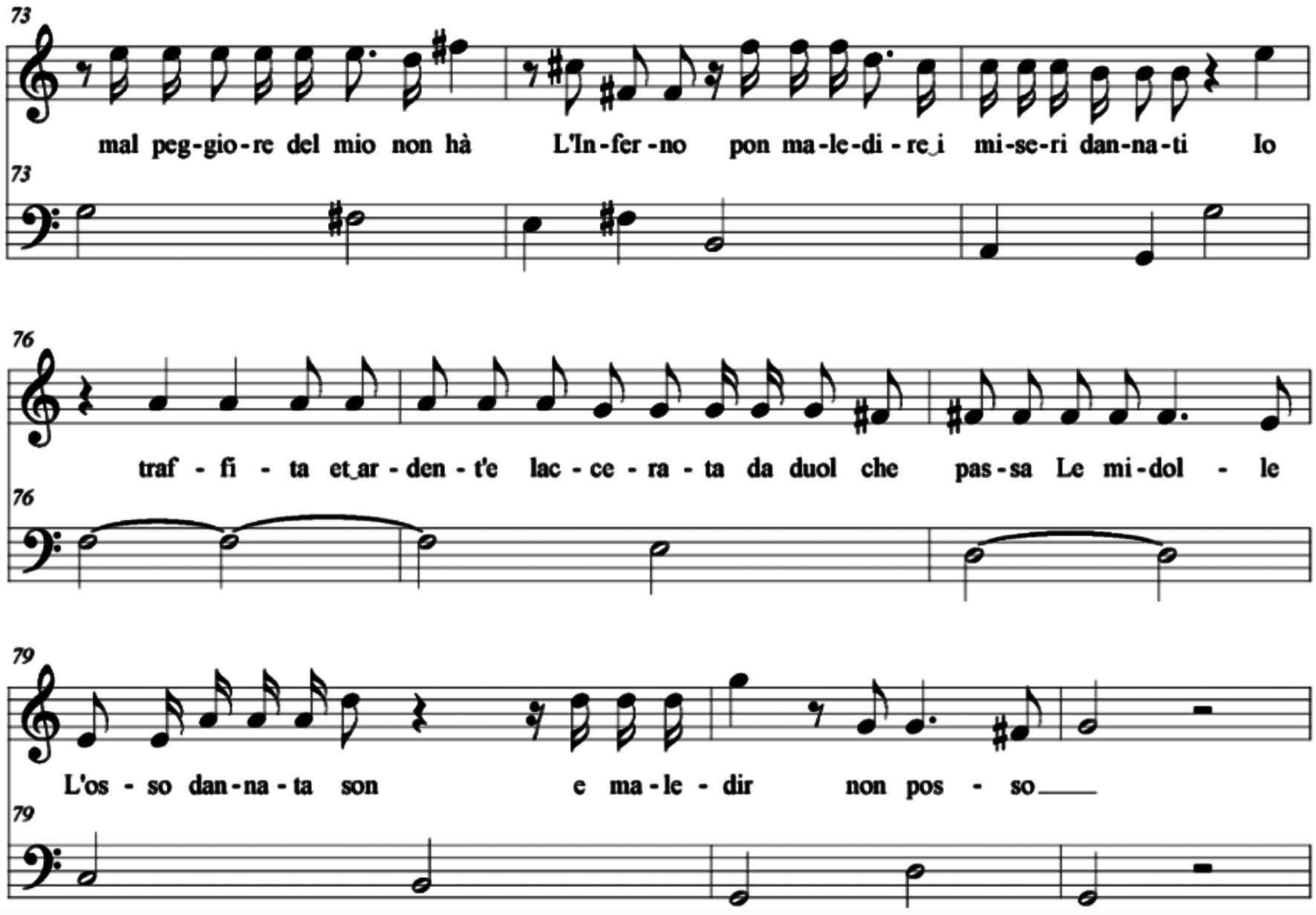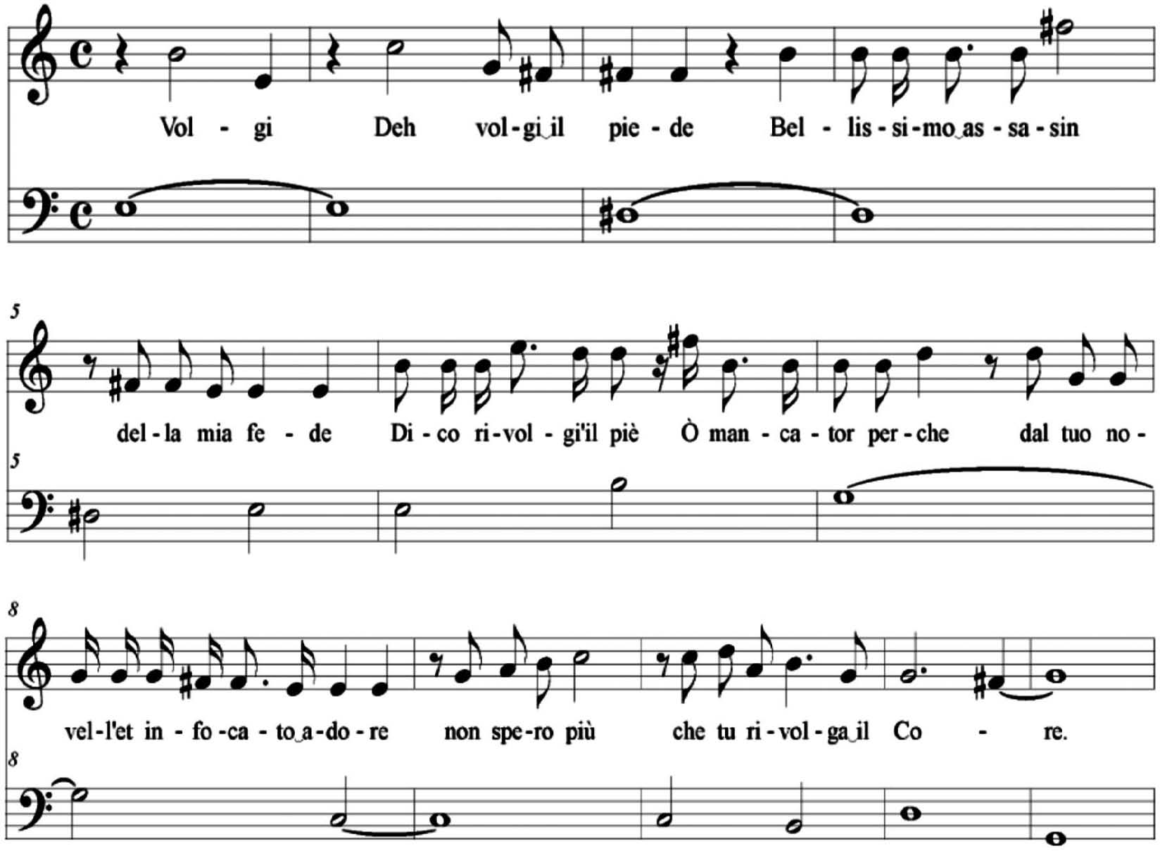 A sentença Belissimo assasin de la mia fede (compasso 3) é expressa musicalmente com contrastes de altura de som e de ritmo. A mínima no Fá sustenido (compasso 4) acentua o efeito da palavra, tronca, assasin. Além disso, o salto ascendente de quinta, que produz a décima com o baixo, remete de certa forma à uma elevação brusca da voz, como em um grito de desespero. Este efeito, seguido por uma pausa que separa o intervalo de oitava descendente seguinte, resulta em um contraste sonoro e afetivo.