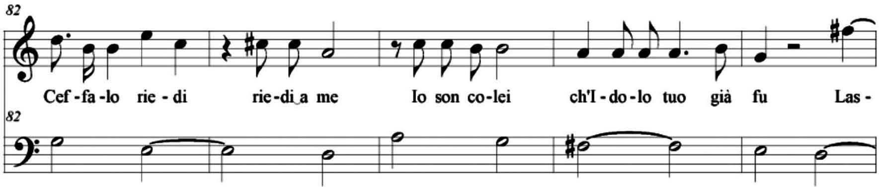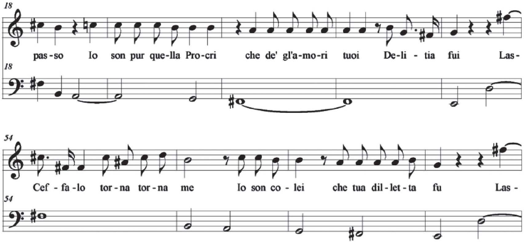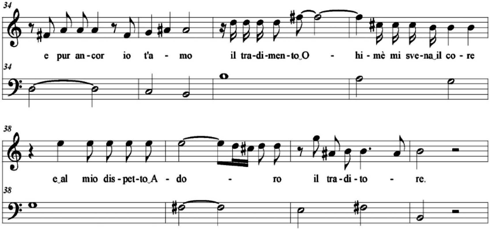 No compasso 36 (Exemplo 2), a sentença il tradimento, Ohimè mi svena il core (A traição, ai de mim, me fere o coração) apresenta o padrão descrito, mas com significativo contraste afetivo. A traição, representada por notas agitadas, em semicolcheias na nota Ré, é bruscamente cortada pelo salto de terça maior na palavra Ohimè. O Fá sustenido estático e prolongado por ligaduras até o primeiro tempo do compasso seguinte contrasta com a passagem agitada anterior e com o retorno das notas em concitato. A contradição da condição de Prócris, entre o amor e o ódio por Céfalo, é bem representada entre os compassos 34 e 41. Em um primeiro momento, a personagem declara que, apesar da traição, ainda ama seu esposo – e pur ancor io t’amo. Mas a palavra amo (compasso 34) recebe do compositor uma dissonância sem resolução. Um efeito semelhante ocorre na passagem e al mio dispetto / Adoro il traditore (e no meu sofrimento / amo o traidor), na qual a palavra Adoro é expressa por outra dissonância. Em ambos os casos, a dissonância gera um efeito inesperado para palavras que remetem à doçura.