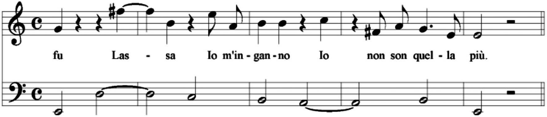 o prefácio do libreto da ópera perdida Le Nozze d’Enea in Lavinia de Monteverdi (libretista desconhecido), que associa este tipo de verso aos personagens irritados: “E assim, para me adequar às pessoas e aos afetos que delas devo exprimir, me são servidos de muitos metros de versos, dando os sdrucciole27 às pessoas baixas e os breves e tronco aos irritados”28 (FABBRI, 2007, p. 26). O uso destes versos tronchi e a repetição do refrão acentuam a obsessão de Prócris, expressa pela frase que se repete de forma imutável: Lassa io m’inganno, io non son quella più. Esta passagem enfatiza a idéia do abandono e da traição do esposo. Prócris já não é mais aquela a quem Céfalo deseja e idolatra, como as memórias lhe insistem em relembrar. O amargo engano (io m’inganno), a percepção de que seu presente não condiz com suas lembranças passadas, se contrapondo à súplica pelo retorno do traidor, é o pensamento fixo que não permite descanso. A idéia fixa no objeto perdido é um sintoma característico da melancolia, relacionada principalmente à melancolia amorosa. Dini (1997) resume, com citações do médico Silvatici, o caráter obsessivo da melancolia amorosa: “como se tentasse expulsar o objeto estranho (memórias) e pertubações presentes à imaginação’, e, ao invés disso, fosse reduzida ao ‘pensamento fixo e contínuo do objeto desejado’’29 (DINI, 1997, p. 10, tradução nossa). O salto de sétima na palavra Lassa, tanto do baixo como da voz, no contratempo, destaca esta expressão de dor do resto do lamento: