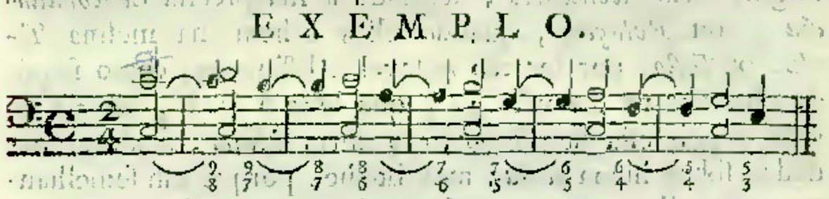 Figura 2: Exemplos de condução de vozes e resolução de dissonâncias no tratado de Francisco Solano (1779).