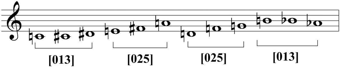 São diversos os critérios que definem similaridades entre conjuntos de classes de notas. A própria organização das 4096 possibilidades combinatoriais no âmbito da gama cromática de doze classes de notas (em conjuntos de três, quatro, cinco, até o limite de nove classes de notas), realizada por Allen Forte (1973)1, agrupa esses conjuntos por relações de similaridade transpositiva e inversiva, denominados posteriormente, por Straus (2000, p. 47) e Roig-Francolí (2008, p. 82) de classes de conjuntos de classes de notas (set classes). Mesmo assim, têm-se buscado ampliar as relações de similaridade com o objetivo de detectar coerência sintática do uso de conjuntos pertencentes às mais diversas classes de conjuntos de classes de notas. Vários autores, além de Forte, já trataram desse tema. Entre eles podemos citar Chrisman (1971), Morris (1979), Lewin (1979-80), Scott e Isaacson (1998), Buchler (2000) e Isaacson (1990).