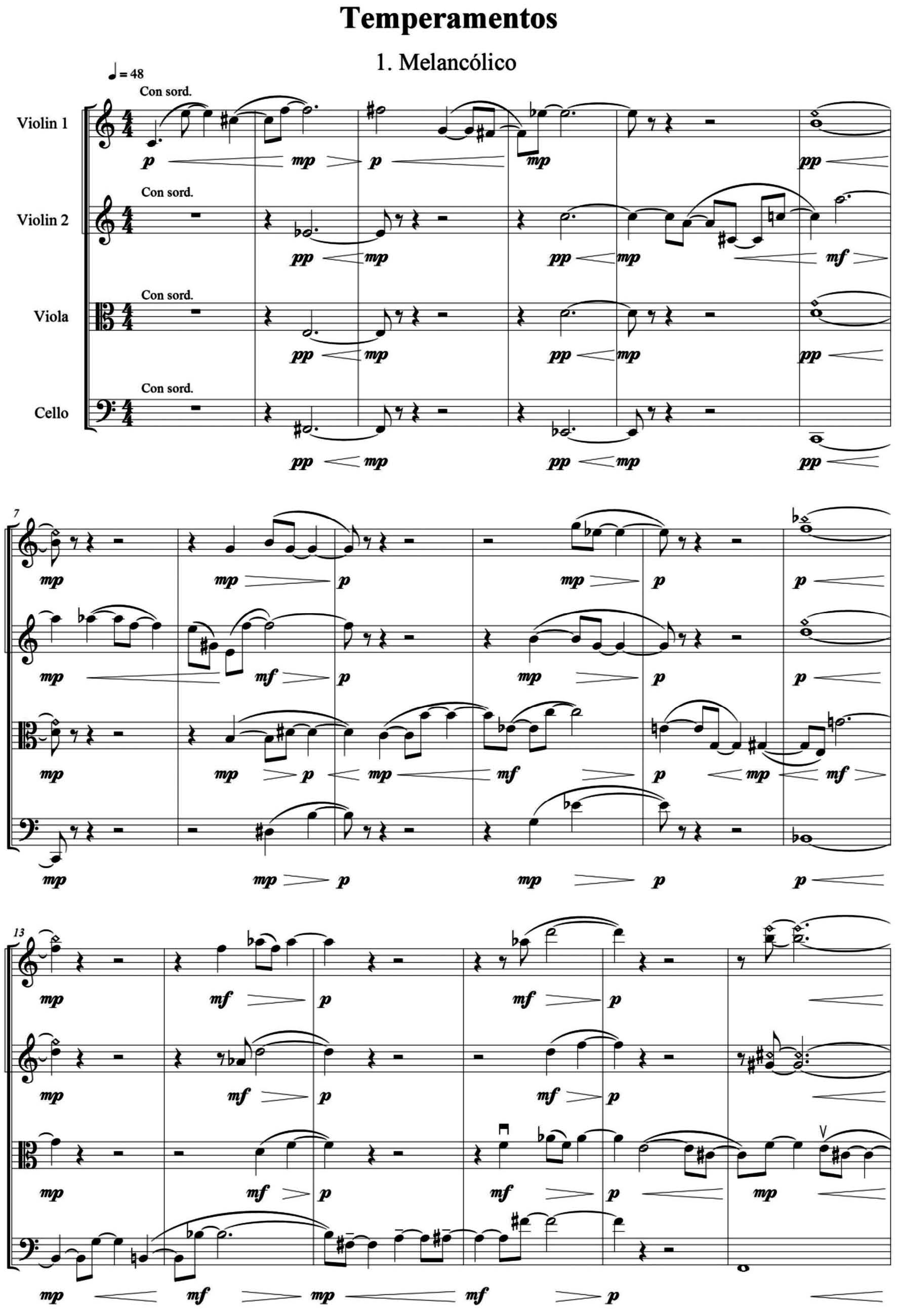 Dessa maneira, com o planejamento da obra Temperamentos, verificamos a aplicabilidade do nosso sistema, bem como, sua abertura a outros elementos não estabelecidos pelas definições iniciais. Nesse caso, tivemos a associação com a teoria dos humores corporais, de Hipócrates, como elemento extra-musical e, a intertextualidade com os procedimentos e sonoridades atribuídas a alguns importantes compositores do Século XX. A pri