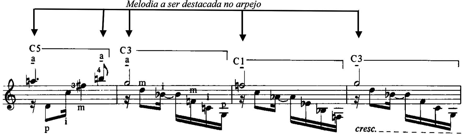 No Estudo nº 5, assim como em todos os Estudos de Fonseca em que há arpejo, esta demanda aparece na forma de melodia acompanhada, como podemos ver claramente no seguinte exemplo. As setas indicam a melodia a ser destacada.