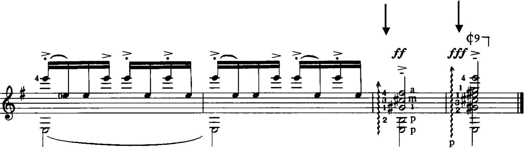 Nos Sete Estudos de Fonseca a utilização de diferentes toques de mão direita é de suma importância para atender as inúmeras indicações de dinâmica marcadas pelo compositor. Como podemos ver no seguinte trecho, em cada compasso podemos usar diferentes fixações dos dedos para conseguir a dinâmica desejada. Os acentos podem ser realizados utilizando o toque nº 3, com o dedo se movendo desde sua base e mantendo as falanges rígidas, enquanto as demais notas podem ser tocadas com o toque nº 1, livre de fixações.
