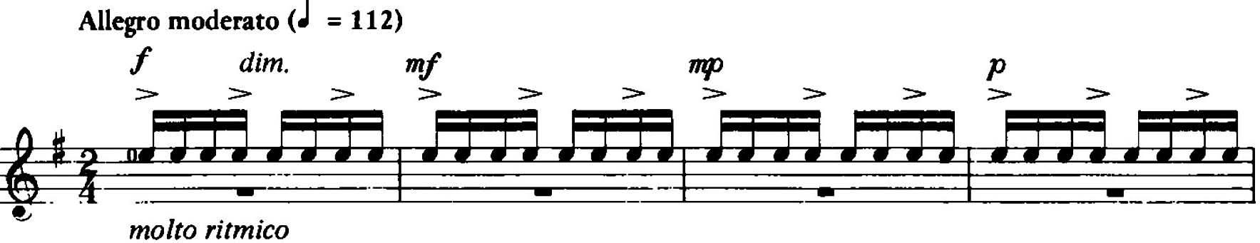 O translado entre a décima e a quinta posição (TL – 4) ocorre em tempo de semicolcheia, o que dificulta sua realização. Cabe destacar que, na sequência de translados (compasso cinco), passamos pelos três setores do diapasão, uma vez que a 13ª posição está localizada no setor de 2ª oitava, a 10ª e 12ª estão no setor de transição e as demais estão no setor de 1ª oitava. Portanto, para a realização deste trecho, precisamos usar três diferentes posicionamentos de mão esquerda, o que pode ser considerado mais um fator de dificuldade na realização desta demanda.