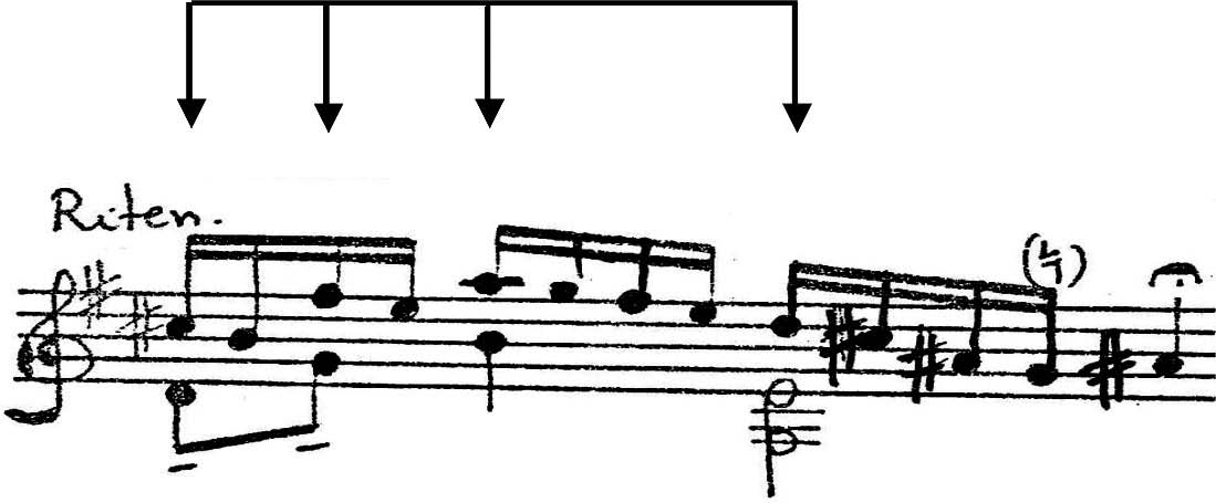 Exmplo 1: Melodia a ser destacada no Arpejo. Estudo nº 5 de Fonseca (compassos 26 - 29).