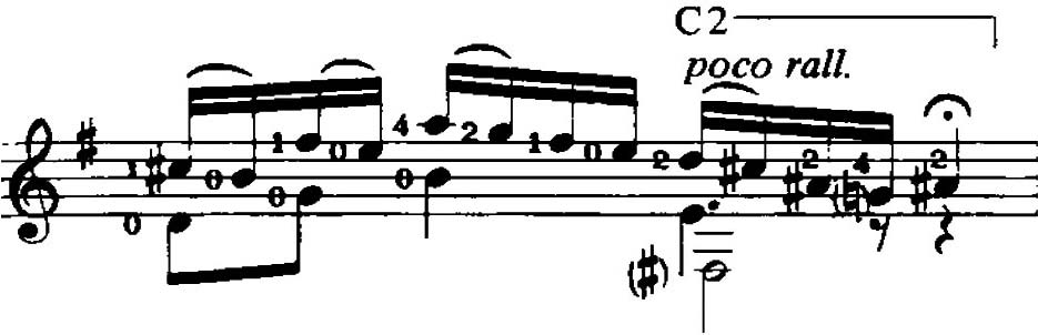 O uso da pestana não está somente ligado ao ato de pressionar várias notas com um só dedo, ela também pode ser usada para obter a melhor condução de vozes (através da sustentação) ou para dar maior estabilidade à mão. No exemplo seguinte, podemos ver como Barbosa-Lima utiliza, em sua digitação, o recurso da meia pestana com o intuito de conduzir corretamente as vozes.