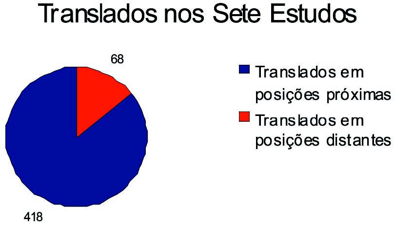 Podemos afirmar, após a análise dos dados contidos na tabela, que, com exceção do Estudo 6, todos os demais estudos contém uma considerável quantidade de translados, destacando-se os Estudos 1, 5 e 7 pela maior frequência destes em relação aos demais. Podemos também destacar que o número de translados entre posições distantes 11 em todos os Sete Estudos é baixo em comparação com o número de translados entre posições próximas, como podemos ver no seguinte gráfico: