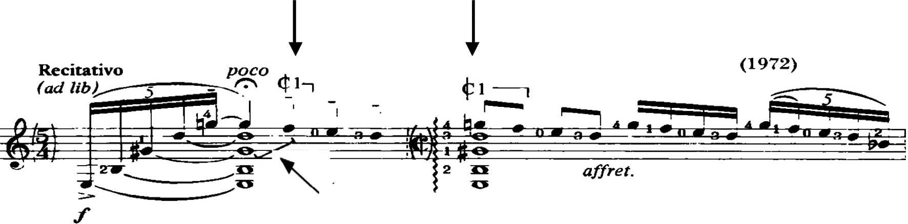 No exemplo anterior, no translado da segunda para décima posição, temos um TL + 712 de difícil realização devido à sua distância, facilitado pela mínima precedente ao translado. Esta mínima nos proporciona um tempo suficiente para visualizar o ponto de chegada do próximo translado. Logo após, se optarmos por fazer as notas Lá e Dó na segunda corda, teremos um translado ainda maior (TL – 8), facilitados pelas cordas soltas do acorde que precede o translado, o que propicia um tempo maior para o posicionamento no ponto de chegada.
