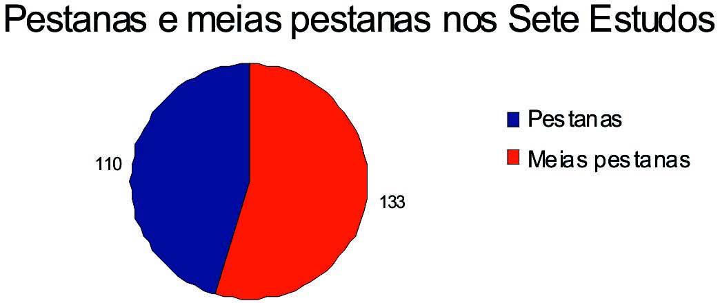 Considerando a série dos Sete Estudos, a utilização das meias pestanas é pouco superior à utilização das pestanas, como podemos ver no seguinte gráfico.
