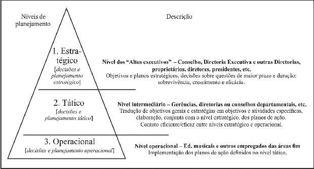 Muitos pressupostos da área administrativa podem nos auxiliar a conduzir melhor nossas atividades e equipes para alcançar objetivos pedagógicos e artísticos. Entre eles está o planejamento estratégico, entendido como o “processo de elaborar a estratégia, definin- do a relação entre a organização e o ambiente. Compreende a tomada de decisão sobre qual padrão de comportamento que a empresa pretende seguir, produtos e serviços que pretende oferecer, e mercados e clientes que pretende atingir” (MAXIMIANO, 2006). Segundo Silva (2009), alguns benefícios são: agilizar decisões, melhorar a comunicação, aumentar a ca- pacidade gerencial para tomar decisões, promover uma consciência coletiva, proporcionar uma visão em conjunto, maior delegação (de autonomia, com descentralização de decisões), oferecer uma direção comum para todos, orientar programas de qualidade e melhorar o re- lacionamento da organização com o seu ambiente interno e externo.![]()