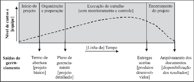 Ilustração 3: Fases do projeto com níveis de custos e alocação de equipe (figura baseada e adaptada de Guia PMBOK,