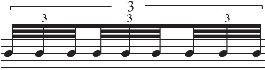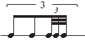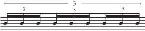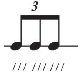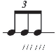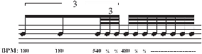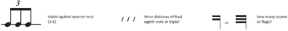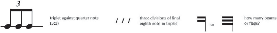 In the Example 3, three equally-spaced iterations against one quarter note will use three notes with the correct number of flags or beams (see Example 3). If either the number of iteration or the speed of beaming is incorrect, then the composer/arranger risks the irri- tation of the performer and the disregard of his/her colleagues. Perhaps this example seems ridiculous in a paper presuming to talk about complex notational procedures, but it does serve to clearly reveal how important and fundamental the principle of correctly linking the number of iteration with beams or flags is embedded in our musical sub-consciousness.