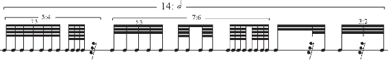 Example 34: A graphic representation of the nested ratio 5:3, within a larger ratio of 7:6, within the borrowed value of 14: half note and prolonged across one quarter note.