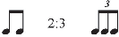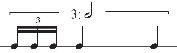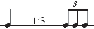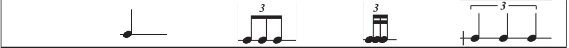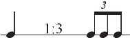 As seen in Example 6, linear ratios provide a wealth of intuitive expectations in our performance and understanding of rhythm. Example 8 shows the expected relationship between a prime value (quarter note) and its division into three equal parts (triplet) (see Example 8). This rule suggests that we expect an equal three-part division to carry a value of one beam/flag more than its prime (see Example 6).