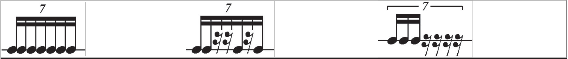 • The 7th row shows the 7-lets prolongated across one quarter note value. As can be seen the resulting value is 20.5 per quarter note, which will require 64th notes, not 32nd (see Example 32).