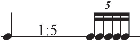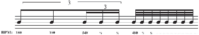 • The 5th row shows a prolongation of the quintuplet to twice its original value, so that it spans across one quarter note value at the rate of 8.75 iterations per quarter note (3 beams/flags).