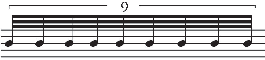 Example 14: Nine equal divisions of a quarter note require three beams/flags