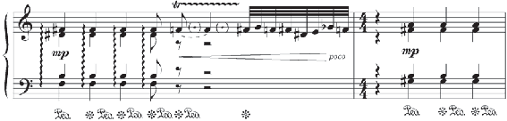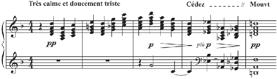 Ao escutar uma música, a transferência é possível quando um fragmento ou aspec- to daquilo que escutamos traz para dentro da obra alguma qualidade, valor ou conceito que geralmente pertence a um contexto musical distinto. Como é necessária a presença de dois objetos para que a transferência ocorra, é a própria música que cria (ou sugere) os dois obje- tos. Canope, de Claude Debussy, é um dos prelúdios mais sofisticados do seu segundo livro de prelúdios, com uma notável densidade construtiva. Canope começa com um conjunto de acordes que se movem em paralelo e que transferem à obra uma sonoridade modal mui- to especial.![]()