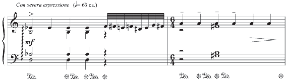 na armadura de clave). Isto resulta de uma obra construída em dois estratos hierárquicos diferentes, um que é tonal e profundo, e outro que está na superfície do discurso e que modaliza a tonalidade. Uma explicação deta- lhada deste procedimento requer uma análise que transcende as dimensões deste texto, e deverá ser realizada de forma exclusiva em um texto futuro.