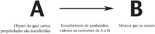 A Figura 1 esquematiza os elementos mínimos presentes em uma transferência. Nesta figura, “B” é a música que se escuta; “A” é o outro objeto que possui certas qualida- des, valores e conceitos diferentes de “B”, e a flecha representa a transferência na qual cer- tas qualidades, valores e conceitos de “A” passam a “B”. Com base neste esquema, realizo a seguir três observações chave sobre transferências.