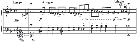 É necessário que o ouvinte conheça “A” de forma genérica (talvez o conhecimento de “A” seja somente genérico na maioria dos casos) para que suas propriedades sejam trans- feridas a “B”. Se um ouvinte desconhece completamente “A”, a transferência não ocorre. No entanto, é muito importante ter em conta que “A” deve ser mais conhecido que “B”. Esta con- dição parece ser certa na maioria dos casos estudados. A abertura da Sonata Opus 31 n.2 de L. Van Beethoven é um exemplo. Como já analisei em outra ocasião (Zampronha, 2006):