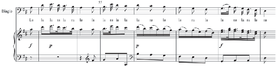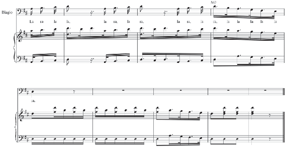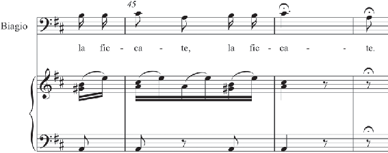 Os últimos compassos da ária foram igualmente reformulados. A figura descen- dente final é cantada uma sexta mais aguda e repetida duas vezes (uma prolongação des- ta frase), enquanto a conclusão orquestral foi encurtada de cinco para dois compassos (Exemplos 3a e 3b), uma modificação que, no seu todo, pode ser vista como tendo um efei- to mais enfático e conclusivo.