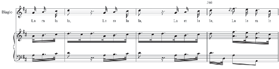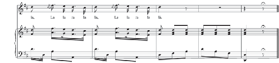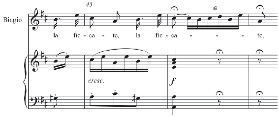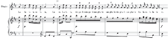 Mais caprichosas, no sentido de que envolvem um grau de recomposição e não uma mera adaptação, são precisamente certas passagens em que a figuração melódica ou rítmi- ca está alterada ou em que uma frase foi prolongada ou encurtada. Nos compassos 44 e 45, a modificação foi muito ligeira, mas, por exemplo, nos compassos 56 e 57, a intervenção foi mais profunda: uma simples escala descendente em colcheias, na versão original, foi subs- tituída porgrupos descendentes de três semicolcheias em tercinas, com o texto alterado de “la ra la | la ra la” para “tingoli mingoli tanghele | tungheli tingheli tangheli” – sílabas com- pletamente sem sentido mas mais “engraçadas” (Exemplos 2a e 2b).![]()