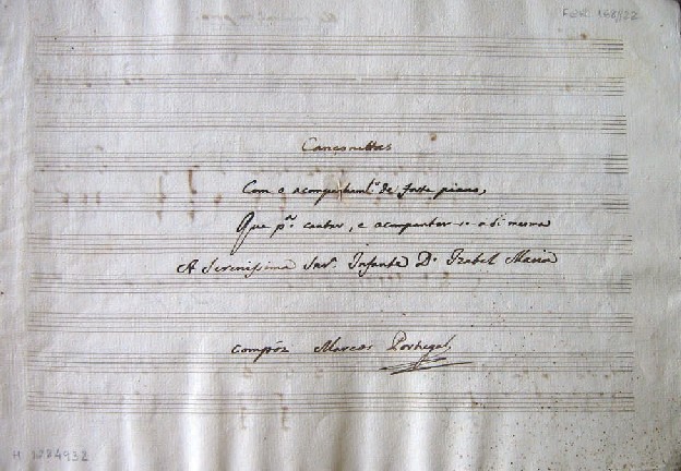 Chama-se a atenção igualmente para a indicação na folha de rosto do conjunto de três canzonette dedicadas a D. Isabel Maria: “Cançonettas / Com o acompanhamt.º de forte piano, / Que p.ª cantar, e acompanhar-se a si mesma / A Serenissima Snr.ª Infanta D. Izabel Maria / compôz Marcos Portugal”. A Infanta cantava e tocava ao mesmo tempo, sendo esta a única fonte com esta indicação. Voltaremos, no entanto, à questão de quem acompanha-