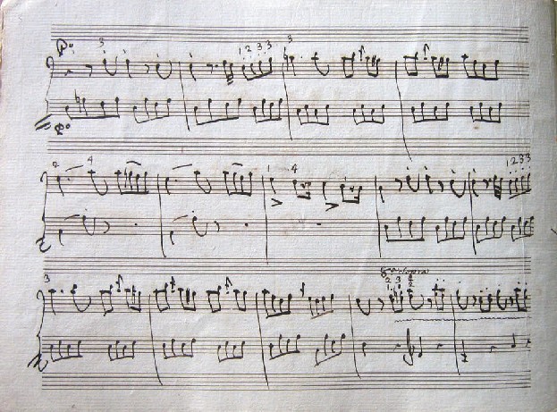Figura n.3: Início da secção principal da abertura de L’oro non compra amore (manuscrito autógrafo, P-Ln F. C. R. 168//18, f. 2r), com dedilhações na mão direita.