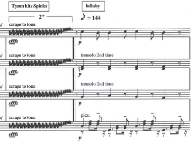 As it pertains to the juxtaposition of “Tyson” and lullaby, and “the cat and dog fi- ght” and country swing passages, compositionally, both sections are effective not because the listener may or may not, directly or indirectly, recognize one or both of the juxtaposed musical “objects,” but because both passages focus on a more fundamentally important ar- tistic concept, contrast. In both cases, violent and harsh noise leads to music written with a tonal center, and fortunately for the listener, supplies the work with structural unity throu-