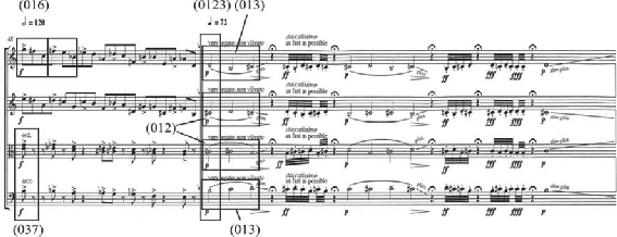 4 Throughout the analysis, set classes are used to label pc sets belonging to the same Tn/TnI type, instead of Allen Forte’s classification system. For example, even though the two sets indentified in the top left of Example 4 share the same prime form 016, they are not pitch class sets 016, in terms of normal form.