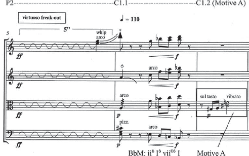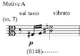 Fourth and finally, Cat O’ Nine Tails uses motivic transformation as an impor- tant unifying device. In Example 7.1, an ascending four-note motive, identified as set class (0148) and labeled Motive A, first appears in the viola part in an otherwise isolated texture. Later, the motive recurs in the same type of texture and is written for the same instrument, even though, as shown in Example 7.2, it is inverted and condensed. Moreover, as illustra- ted in the interval vector in Table 3, both fragments lack an interval of a major second, and although Motive A.1 is different in terms of interval content, its use as a solo fragment in a somewhat frenetic soundscape is clearly based on the first appearance of Motive A. Usually performed as part of a cartoon event, Motive A and its subsequent transformations empha- size the interval of a tritone and a major or minor third. Whether the motive appears as an ascending or descending line, performed legato or staccato, or by one or two instruments, any subsequent transformation of Motive A retains its distinct character. The importan- ce placed on this motive as a structural signpost within the seemingly open-ended and disjunctive episodes makes the gesture a strong musical anchor that a listener can easily recognize.![]()
