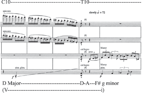 Third, some events are connected by functional harmonic progressions and com- mon-tone transitions. In Example 6, the descending D major scale in measures 107-108 leads to a D-A dyad. Due to the abundance of written rests and abrupt interruptions found in pre- vious events, one expects the goal of the passage to be the dyad in measure 108 and the sub- sequent rest. With the entrance of the viola on beat 2 in measure 110, however, the miss- ing F# appears and resolves to the subsequent g-minor “blues” allusion. The D-major scalar passage in Example 6 functions as a dominant anacrusis, and yet again our established ex- pectations are circumvented. And although some events employ this type of progression, most events are connected by common-tone transitions and tonal center, including Zorn’s cartoon events and passages that feature the chromatic aggregate.