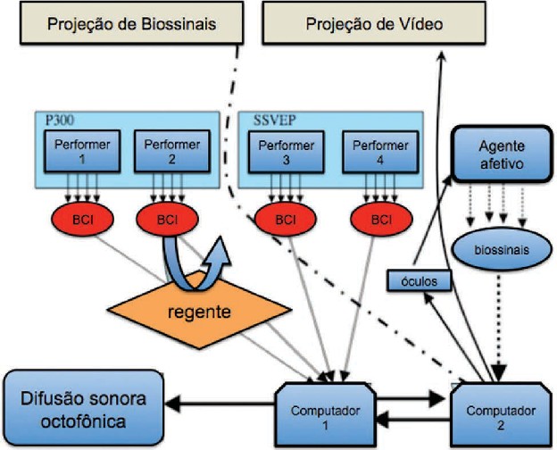 Na Figura 1, há uma descrição geral da infraestrura criada para a MBO. A obra pro- pôs uma interação multimodal utilizando um quarteto de cordas virtuais, vídeo e as ações de um regente para articular a re-estruturação desses elementos a partir do processamento de bio-sinais de um “agente afetivo” e de quatro outros performers que utilizaram interfaces cérebro-máquina (BCI). No escopo deste artigo concentramo-nos na descrição das decisões composicionais que foram tomadas para integrar e contextualizar a performance, para ou- tras informações reportamo-nos a GROUX et al. (2010).