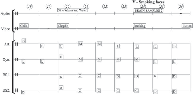 15 parciais do espectro sonoro e detectou-se os ataques mais proeminentes. Essas caracte- rísticas extraídas do som foram relacionadas com transformações texturais como variação de densidade, aglomeração e erosão produzidas a partir da paleta orquestral. Alinhando-se assim o conteúdo simbólico da partitura com as transformações nas imagens.![]()