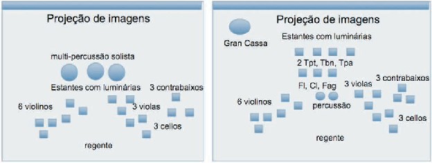 Nesse concerto, a partir da captação dos ataques e da variação do conteúdo espec- tral do som da orquestra, descritores de áudio foram utilizados para controlar imagens gera- das em tempo real. Mais especificamente, comentamos duas obras: Curto Circuito II (2010) e Cadência Textural I (2010) que focaram o sincronismo rítmico, o uso de iluminação e a transformação em imagens. Na primeira obra o grupo orquestral foi reduzido para 15 cordas (3+3+3+3+3) com partes e luminárias individuais para cada instrumento e para percussão solista (vide Figura 3). Na segunda obra, ao grupo reduzido de cordas somaram-se madeiras (flauta, clarineta e fagote) e metais (2 trompetes, trompa e trombone), dois percussionistas solistas e uma Gran Cassa (vide Figura 3).