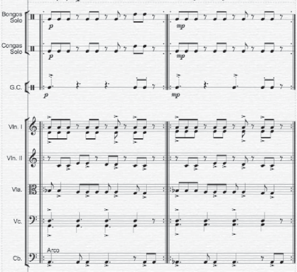 crito em (COHN, 1992; CAMPOS, 2012), com uma textura construída por sons e imagens. Os dois percussionistas solistas, ao executar um bongô e duas congas com as mãos, gera- vam transformações rítmicas que se acumulavam gradualmente com as transformações na orquestração e as imagens espelhavam o desenvolvimento sonoro também num processo gradual e iterativo (vide Figura 5). A cada passo da trajetória musical, a orquestra aproxi- mava-se da citação da figura rítmica da obra de Reich e na convergência final, nos últimos compassos da obra, todos os instrumentos tocam o mesmo padrão rítmico e depois a massa sonora é diluída rapidamente até sobrar apenas o silêncio.